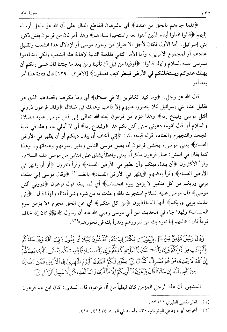 وَقالَ رَجُلٌ مُؤْمِنٌ مِنْ آلِ فِرْعَوْنَ يَكْتُمُ إِيمانَهُ أَتَقْتُلُونَ رَجُلاً أَنْ يَقُولَ رَبِّيَ اللَّهُ وَقَدْ جاءَكُمْ بِالْبَيِّناتِ مِنْ رَبِّكُمْ وَإِنْ يَكُ كاذِباً فَعَلَيْهِ كَذِبُهُ وَإِنْ يَكُ صادِقاً يُصِبْكُمْ بَعْضُ الَّذِي يَعِدُكُمْ إِنَّ اللَّهَ لَا يَهْدِي مَنْ هُوَ مُسْرِفٌ كَذَّابٌ (28) يَا قَوْمِ لَكُمُ الْمُلْكُ الْيَوْمَ ظاهِرِينَ فِي الْأَرْضِ فَمَنْ يَنْصُرُنا مِنْ بَأْسِ اللَّهِ إِنْ جاءَنا قالَ فِرْعَوْنُ مَا أُرِيكُمْ إِلاَّ مَا أَرى وَما أَهْدِيكُمْ إِلاَّ سَبِيلَ الرَّشادِ (29)