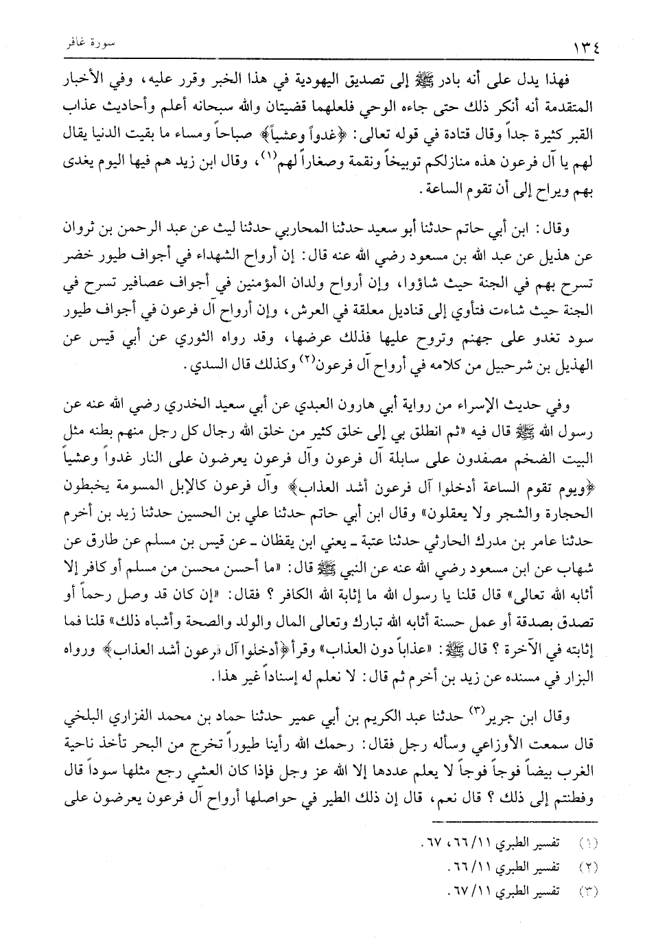 وَقَالَ ابْنُ جَرِيرٍ «3» حَدَّثَنَا عَبْدُ الْكَرِيمِ بْنُ أَبِي عُمَيْرٍ حَدَّثَنَا حَمَّادُ بْنُ مُحَمَّدٍ الْفَزَارِيُّ الْبَلْخِيُّ قَالَ سَمِعْتُ الْأَوْزَاعِيَّ وَسَأَلَهُ رَجُلٌ فَقَالَ: رَحِمَكَ اللَّهُ رَأَيْنَا طُيُورًا تَخْرُجُ مِنَ الْبَحْرِ تَأْخُذُ نَاحِيَةَ الْغَرْبِ بِيضًا فَوْجًا فَوْجًا لَا يَعْلَمُ عَدَدَهَا إِلَّا اللَّهُ عَزَّ وَجَلَّ فَإِذَا كَانَ الْعَشِيُّ رَجَعَ مِثْلُهَا سُودًا قَالَ وَفَطِنْتُمْ إِلَى ذَلِكَ؟ قَالَ نعم، قال إن ذلك الطير في حواصلها أرواح آل فرعون يعرضون على