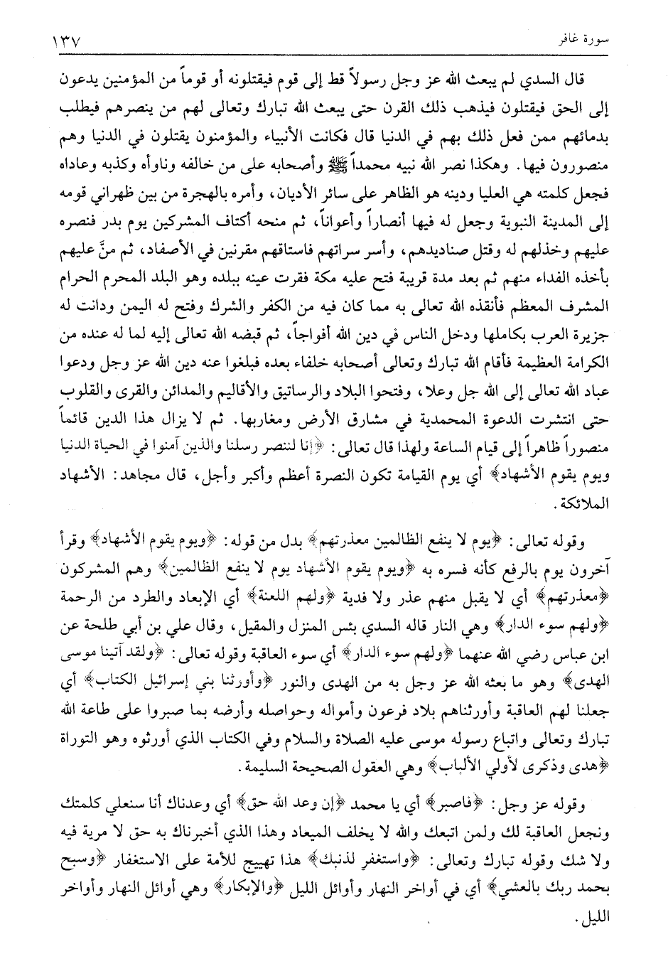 وقوله تعالى: يَوْمَ لَا يَنْفَعُ الظَّالِمِينَ مَعْذِرَتُهُمْ بَدَلٌ مِنْ قَوْلِهِ: وَيَوْمَ يَقُومُ الْأَشْهادُ وَقَرَأَ آخَرُونَ يَوْمُ بِالرَّفْعِ كَأَنَّهُ فَسَّرَهُ بِهِ وَيَوْمَ يَقُومُ الْأَشْهادُ يَوْمَ لَا يَنْفَعُ الظَّالِمِينَ وَهُمُ الْمُشْرِكُونَ مَعْذِرَتُهُمْ أَيْ لَا يُقْبَلُ مِنْهُمْ عُذْرٌ وَلَا فِدْيَةٌ وَلَهُمُ اللَّعْنَةُ أَيِ الْإِبْعَادُ وَالطَّرْدُ مِنَ الرَّحْمَةِ وَلَهُمْ سُوءُ الدَّارِ وَهِيَ النَّارُ قَالَهُ السُّدِّيُّ بِئْسَ الْمَنْزِلُ وَالْمَقِيلُ، وَقَالَ عَلِيُّ بْنُ أَبِي طَلْحَةَ عَنِ ابْنِ عَبَّاسٍ رَضِيَ اللَّهُ عَنْهُمَا وَلَهُمْ سُوءُ الدَّارِ أَيْ سُوءُ الْعَاقِبَةِ وَقَوْلُهُ تعالى: وَلَقَدْ آتَيْنا مُوسَى الْهُدى وَهُوَ مَا بَعَثَهُ الله عز وجل بِهِ مِنَ الْهُدَى وَالنُّورِ وَأَوْرَثْنا بَنِي إِسْرائِيلَ الْكِتابَ أَيْ جَعَلْنَا لَهُمُ الْعَاقِبَةَ وَأَوْرَثْنَاهُمْ بِلَادَ فِرْعَوْنَ وَأَمْوَالَهُ وَحَوَاصِلَهُ وَأَرْضَهُ بِمَا صَبَرُوا عَلَى طاعة الله تبارك وتعالى واتباع رسوله موسى عليه الصلاة والسلام وَفِي الْكِتَابِ الَّذِي أُورِثُوهُ وَهُوَ التَّوْرَاةُ هُدىً وَذِكْرى لِأُولِي الْأَلْبابِ وَهِيَ الْعُقُولُ الصَّحِيحَةُ السَّلِيمَةُ.