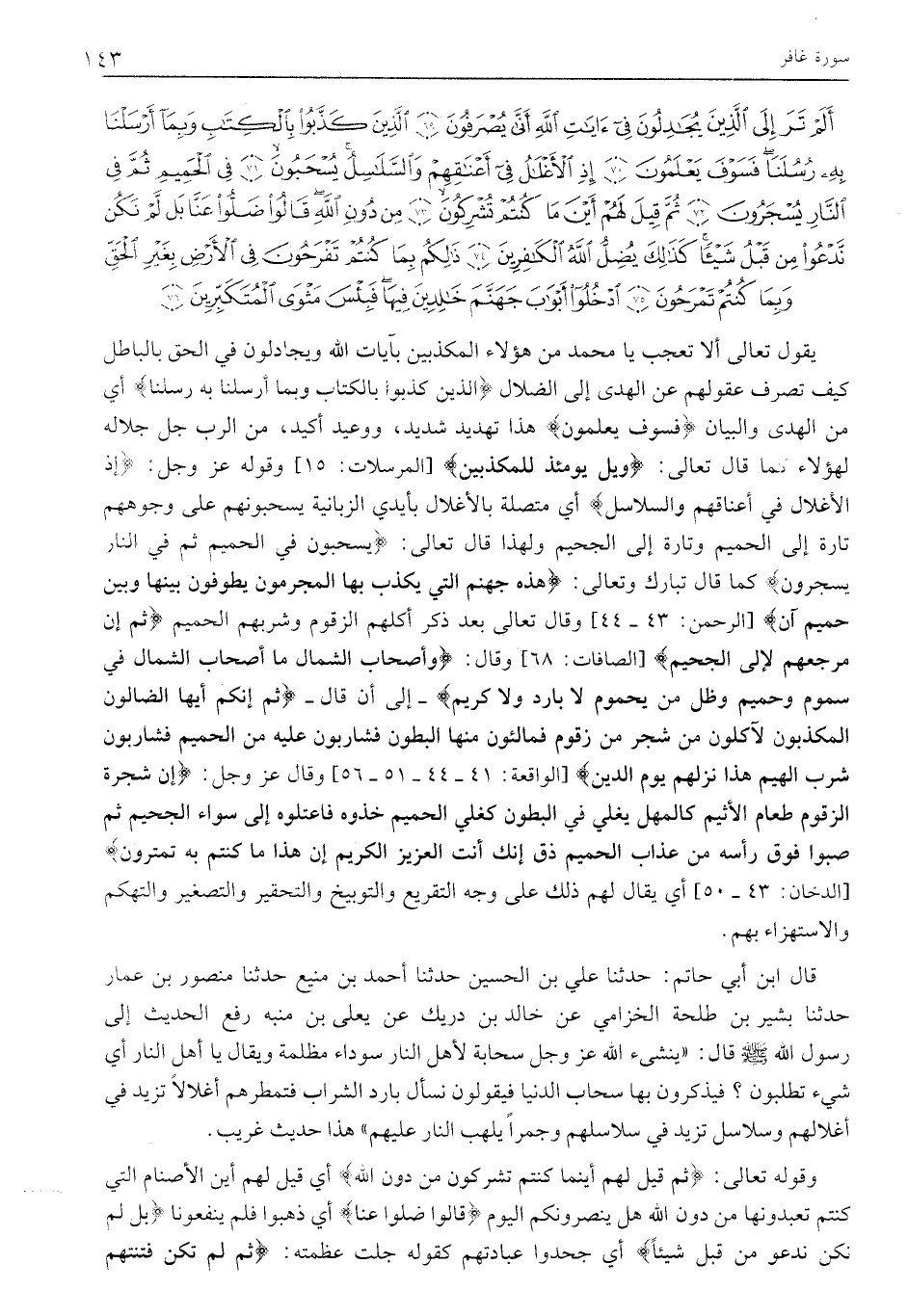 أَلَمْ تَرَ إِلَى الَّذِينَ يُجادِلُونَ فِي آياتِ اللَّهِ أَنَّى يُصْرَفُونَ (69) الَّذِينَ كَذَّبُوا بِالْكِتابِ وَبِما أَرْسَلْنا بِهِ رُسُلَنا فَسَوْفَ يَعْلَمُونَ (70) إِذِ الْأَغْلالُ فِي أَعْناقِهِمْ وَالسَّلاسِلُ يُسْحَبُونَ (71) فِي الْحَمِيمِ ثُمَّ فِي النَّارِ يُسْجَرُونَ (72) ثُمَّ قِيلَ لَهُمْ أَيْنَ مَا كُنْتُمْ تُشْرِكُونَ (73)