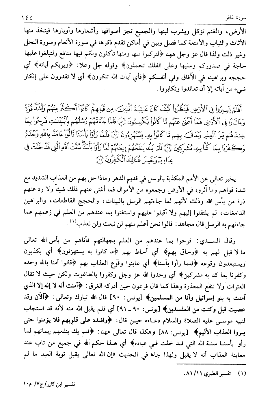 أَفَلَمْ يَسِيرُوا فِي الْأَرْضِ فَيَنْظُرُوا كَيْفَ كانَ عاقِبَةُ الَّذِينَ مِنْ قَبْلِهِمْ كانُوا أَكْثَرَ مِنْهُمْ وَأَشَدَّ قُوَّةً وَآثاراً فِي الْأَرْضِ فَما أَغْنى عَنْهُمْ مَا كانُوا يَكْسِبُونَ (82) فَلَمَّا جاءَتْهُمْ رُسُلُهُمْ بِالْبَيِّناتِ فَرِحُوا بِما عِنْدَهُمْ مِنَ الْعِلْمِ وَحاقَ بِهِمْ ما كانُوا بِهِ يَسْتَهْزِؤُنَ (83) فَلَمَّا رَأَوْا بَأْسَنا قالُوا آمَنَّا بِاللَّهِ وَحْدَهُ وَكَفَرْنا بِما كُنَّا بِهِ مُشْرِكِينَ (84) فَلَمْ يَكُ يَنْفَعُهُمْ إِيمانُهُمْ لَمَّا رَأَوْا بَأْسَنا سُنَّتَ اللَّهِ الَّتِي قَدْ خَلَتْ فِي عِبادِهِ وَخَسِرَ هُنالِكَ الْكافِرُونَ (85)