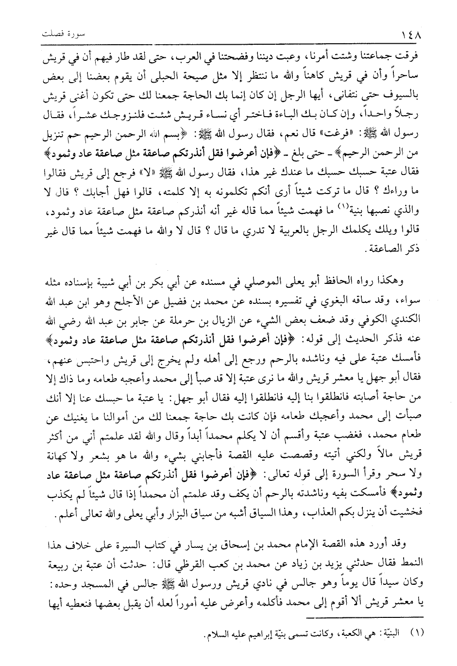 فَرَّقْتَ جَمَاعَتَنَا وَشَتَّتَّ أَمْرَنَا، وَعِبْتَ دِينَنَا وَفَضَحْتَنَا فِي الْعَرَبِ، حَتَّى لَقَدْ طَارَ فِيهِمْ أَنَّ فِي قُرَيْشٍ سَاحِرًا وَأَنَّ فِي قُرَيْشٍ كَاهِنًا والله ما ننتظر إِلَّا مِثْلَ صَيْحَةِ الْحُبْلَى أَنْ يَقُومَ بَعْضُنَا إِلَى بَعْضٍ بِالسُّيُوفِ حَتَّى نَتَفَانَى، أَيُّهَا الرَّجُلُ إِنْ كَانَ إِنَّمَا بِكَ الْحَاجَةُ جَمَعْنَا لَكَ حتى تكون أغنى قريش رجلا واحدا، وإن كان بِكَ الْبَاءَةُ فَاخْتَرْ أَيَّ نِسَاءِ قُرَيْشٍ شِئْتَ فَلْنُزَوِّجْكَ عَشْرًا، فَقَالَ رَسُولُ اللَّهِ صَلَّى اللَّهُ عَلَيْهِ وَسَلَّمَ: «فَرَغْتَ» قَالَ نَعَمْ، فَقَالَ رَسُولُ اللَّهِ صَلَّى اللَّهُ عَلَيْهِ وَسَلَّمَ: بِسْمِ اللَّهِ الرَّحْمنِ الرَّحِيمِ حم تَنْزِيلٌ مِنَ الرَّحْمنِ الرَّحِيمِ- حَتَّى بَلَغَ- فَإِنْ أَعْرَضُوا فَقُلْ أَنْذَرْتُكُمْ صاعِقَةً مِثْلَ صاعِقَةِ عادٍ وَثَمُودَ فَقَالَ عُتْبَةُ حَسْبُكَ حسبك ما عندك غير هَذَا، فَقَالَ رَسُولُ اللَّهِ صَلَّى اللَّهُ عَلَيْهِ وَسَلَّمَ «لَا» فَرَجَعَ إِلَى قُرَيْشٍ فَقَالُوا مَا وَرَاءَكَ؟ قَالَ مَا تَرَكْتُ شَيْئًا أَرَى أَنَّكُمْ تُكَلِّمُونَهُ بِهِ إِلَّا كَلَّمْتُهُ، قَالُوا فَهَلْ أَجَابَكَ؟ قَالَ لَا وَالَّذِي نَصَبَهَا بَنِيَّةً «1» مَا فَهِمْتُ شَيْئًا مما قاله غَيْرَ أَنَّهُ أَنْذَرَكُمْ صَاعِقَةً مِثْلَ صَاعِقَةِ عَادٍ وثمود، قالوا ويلك يكلمك الرجل بالعربية لا تَدْرِي مَا قَالَ؟ قَالَ لَا وَاللَّهِ مَا فَهِمْتُ شَيْئًا مِمَّا قَالَ غَيْرَ ذِكْرِ الصَّاعِقَةِ.