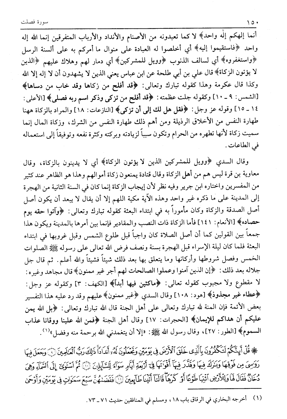 وَقَالَ السُّدِّيُّ وَوَيْلٌ لِلْمُشْرِكِينَ الَّذِينَ لَا يُؤْتُونَ الزَّكاةَ أَيْ لَا يَدِينُونَ بِالزَّكَاةِ، وَقَالَ مُعَاوِيَةُ بْنُ قُرَّةَ لَيْسَ هُمْ مِنْ أَهْلِ الزَّكَاةِ وَقَالَ قَتَادَةُ يَمْنَعُونَ زَكَاةَ أَمْوَالِهِمْ وَهَذَا هُوَ الظَّاهِرُ عِنْدَ كَثِيرٍ مِنَ الْمُفَسِّرِينَ وَاخْتَارَهُ ابْنُ جَرِيرٍ وَفِيهِ نَظَرٌ لِأَنَّ إِيجَابَ الزَّكَاةِ إِنَّمَا كَانَ فِي السَّنَةِ الثَّانِيَةِ مِنَ الْهِجْرَةِ إِلَى الْمَدِينَةِ عَلَى مَا ذَكَرَهُ غَيْرُ وَاحِدٍ وَهَذِهِ الْآيَةُ مَكِّيَّةٌ اللَّهُمَّ إِلَّا أَنْ يُقَالَ لَا يبعد أن يكون أصل أصل الصدقة والزكاة وكان مأمورا به في ابتداء البعثة كقوله تبارك وتعالى: وَآتُوا حَقَّهُ يَوْمَ حَصادِهِ [الْأَنْعَامِ: 141] فَأَمَّا الزَّكَاةُ ذَاتُ النُّصُبِ وَالْمَقَادِيرِ فَإِنَّمَا بُيِّنَ أَمْرُهَا بِالْمَدِينَةِ وَيَكُونُ هَذَا جَمْعًا بَيْنَ الْقَوْلَيْنِ كَمَا أَنَّ أَصْلَ الصَّلَاةِ كَانَ وَاجِبًا قَبْلَ طُلُوعِ الشَّمْسِ وَقَبْلَ غُرُوبِهَا فِي ابْتِدَاءِ الْبِعْثَةِ فَلَمَّا كَانَ لَيْلَةُ الْإِسْرَاءِ قَبْلَ الْهِجْرَةِ بِسَنَةٍ وَنِصْفٍ فَرَضَ اللَّهِ تَعَالَى عَلَى رَسُولِهِ صَلَّى اللَّهُ عَلَيْهِ وَسَلَّمَ الصَّلَوَاتِ الْخَمْسَ وَفَصَّلَ شُرُوطَهَا وَأَرْكَانَهَا وَمَا يَتَعَلَّقُ بِهَا بَعْدَ ذَلِكَ شَيْئًا فَشَيْئًا وَاللَّهُ أَعْلَمُ. ثُمَّ قال جل جلاله بَعْدَ ذَلِكَ: إِنَّ الَّذِينَ آمَنُوا وَعَمِلُوا الصَّالِحاتِ لَهُمْ أَجْرٌ غَيْرُ مَمْنُونٍ قَالَ مُجَاهِدٌ وَغَيْرُهُ: