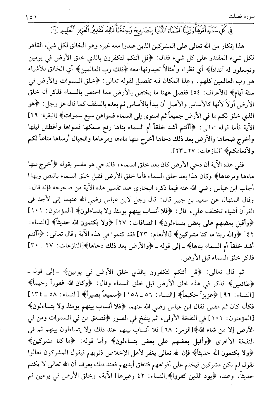 ثم قال تعالى: قُلْ أَإِنَّكُمْ لَتَكْفُرُونَ بِالَّذِي خَلَقَ الْأَرْضَ فِي يَوْمَيْنِ- إِلَى قَوْلِهِ- طائِعِينَ فَذَكَرَ فِي هَذِهِ خَلْقَ الْأَرْضِ قَبْلَ خَلْقِ السَّمَاءِ وَقَالَ: وَكانَ اللَّهُ غَفُوراً رَحِيماً [النِّسَاءِ: 96] عَزِيزاً حَكِيماً [النِّسَاءِ: 56- 158] سَمِيعاً بَصِيراً [النساء: 58- 134] فكأنه كان ثم مضى فقال ابن عباس رضي الله عنهما فَلا أَنْسابَ بَيْنَهُمْ يَوْمَئِذٍ وَلا يَتَساءَلُونَ [الْمُؤْمِنُونَ: 101] فِي النَّفْخَةِ الْأُولَى، ثُمَّ يُنْفَخُ فِي الصُّورِ فَصَعِقَ مَنْ فِي السَّماواتِ وَمَنْ فِي الْأَرْضِ إِلَّا مَنْ شاءَ اللَّهُ [الزُّمَرِ: 68] فَلَا أَنْسَابَ بينهم عند ذلك ولا يتساءلون بينهم ثُمَّ فِي النَّفْخَةِ الْأُخْرَى وَأَقْبَلَ بَعْضُهُمْ عَلى بَعْضٍ يَتَساءَلُونَ وَأَمَّا قَوْلُهُ: مَا كُنَّا مُشْرِكِينَ وَلا يَكْتُمُونَ اللَّهَ حَدِيثاً فإن الله تعالى يغفر لأهل الإخلاص ذنوبهم فيقول الْمُشْرِكُونَ تَعَالَوْا نَقُولُ لَمْ نَكُنْ مُشْرِكِينَ فَيَخْتِمُ عَلَى أَفْوَاهِهِمْ فَتَنْطِقُ أَيْدِيهِمْ فَعِنْدَ ذَلِكَ يُعْرَفُ أن الله تعالى لَا يُكْتَمُ حَدِيثًا، وَعِنْدَهُ يَوَدُّ الَّذِينَ كَفَرُوا [النساء: 42 وغيرها] الآية، وَخَلَقَ الْأَرْضَ فِي يَوْمَيْنِ ثُمَّ