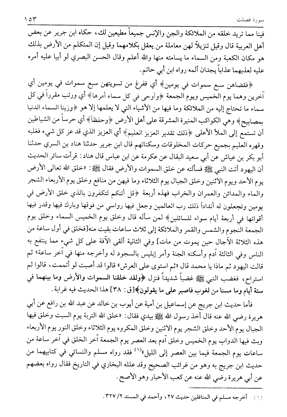 فَأَمَّا حَدِيثُ ابْنِ جُرَيْجٍ عَنْ إِسْمَاعِيلُ بْنُ أُمَيَّةَ عَنْ أَيُّوبَ بْنِ خَالِدٍ عَنْ عَبْدِ اللَّهِ بْنِ رَافِعٍ عَنْ أَبِي هُرَيْرَةَ رَضِيَ اللَّهُ عَنْهُ قَالَ أَخَذَ رَسُولُ اللَّهِ صَلَّى اللَّهُ عَلَيْهِ وَسَلَّمَ بِيَدِي فَقَالَ: «خَلَقَ اللَّهُ التُّرْبَةَ يَوْمَ السَّبْتِ وَخَلَقَ فِيهَا الْجِبَالَ يَوْمَ الْأَحَدِ وَخَلَقَ الشَّجَرَ يَوْمَ الِاثْنَيْنِ وَخَلَقَ الْمَكْرُوهَ يَوْمَ الثُّلَاثَاءِ وَخَلَقَ النُّورَ يَوْمَ الْأَرْبِعَاءِ وَبَثَّ فِيهَا الدَّوَابَّ يَوْمَ الْخَمِيسِ وَخَلَقَ آدَمَ بَعْدَ الْعَصْرِ يَوْمَ الْجُمُعَةِ آخِرَ الْخَلْقِ فِي آخِرِ سَاعَةٍ مِنْ سَاعَاتِ يوم الْجُمُعَةِ فِيمَا بَيْنَ الْعَصْرِ إِلَى اللَّيْلِ» «1» فَقَدْ رواه مسلم والنسائي في كتابيهما من حَدِيثِ ابْنِ جُرَيْجٍ بِهِ وَهُوَ مِنْ غَرَائِبِ الصَّحِيحِ وَقَدْ عَلَّلَهُ الْبُخَارِيُّ فِي التَّارِيخِ فَقَالَ رَوَاهُ بَعْضُهُمْ عَنْ أَبِي هُرَيْرَةَ رَضِيَ اللَّهُ عَنْهُ عَنِ كعب الأحبار وهو الأصح.