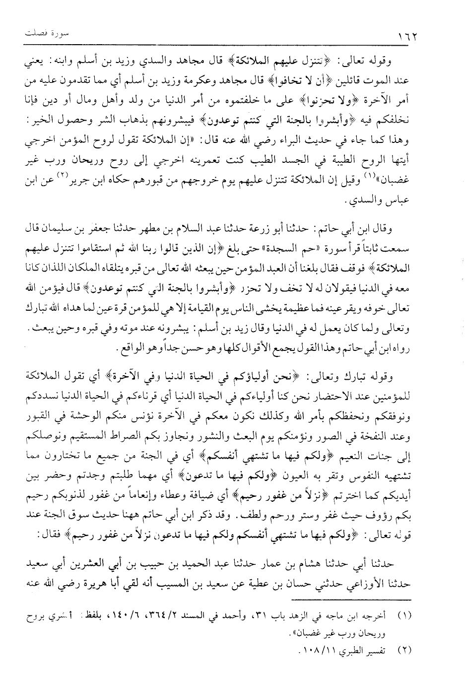 وقوله تعالى: تَتَنَزَّلُ عَلَيْهِمُ الْمَلائِكَةُ قَالَ مُجَاهِدٌ وَالسُّدِّيُّ وَزَيْدُ بْنُ أَسْلَمَ وَابْنُهُ: يَعْنِي عِنْدَ الْمَوْتِ قَائِلِينَ أَلَّا تَخافُوا قَالَ مُجَاهِدٌ وَعِكْرِمَةُ وَزَيْدُ بْنُ أَسْلَمَ أَيْ مِمَّا تُقْدِمُونَ عَلَيْهِ مِنْ أَمْرِ الآخرة وَلا تَحْزَنُوا عَلَى مَا خَلَّفْتُمُوهُ مِنْ أَمْرِ الدُّنْيَا مِنْ وَلَدٍ وَأَهْلٍ وَمَالٍ أَوْ دَيْنٍ فَإِنَّا نَخْلُفُكُمْ فِيهِ وَأَبْشِرُوا بِالْجَنَّةِ الَّتِي كُنْتُمْ تُوعَدُونَ فَيُبَشِّرُونَهُمْ بذهاب الشر وحصول الخير: