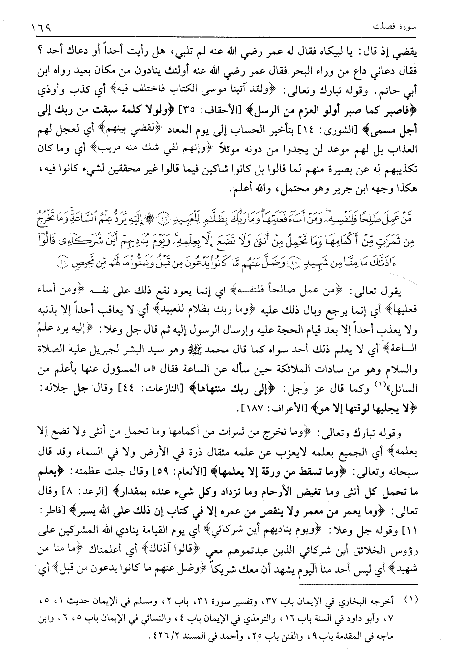 مَنْ عَمِلَ صالِحاً فَلِنَفْسِهِ وَمَنْ أَساءَ فَعَلَيْها وَما رَبُّكَ بِظَلاَّمٍ لِلْعَبِيدِ (46) إِلَيْهِ يُرَدُّ عِلْمُ السَّاعَةِ وَما تَخْرُجُ مِنْ ثَمَراتٍ مِنْ أَكْمامِها وَما تَحْمِلُ مِنْ أُنْثى وَلا تَضَعُ إِلاَّ بِعِلْمِهِ وَيَوْمَ يُنادِيهِمْ أَيْنَ شُرَكائِي قالُوا آذَنَّاكَ مَا مِنَّا مِنْ شَهِيدٍ (47) وَضَلَّ عَنْهُمْ مَا كانُوا يَدْعُونَ مِنْ قَبْلُ وَظَنُّوا مَا لَهُمْ مِنْ مَحِيصٍ (48)