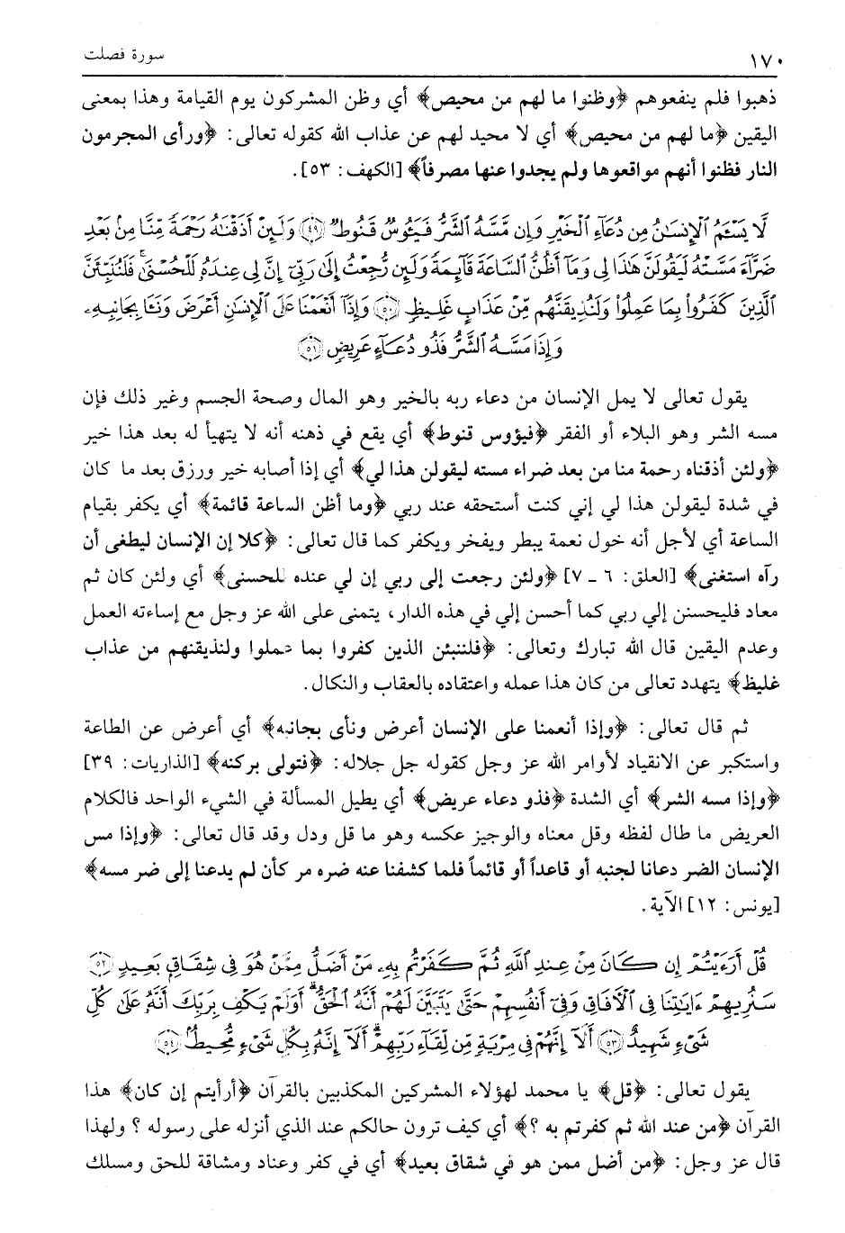 يَقُولُ تَعَالَى لَا يمل الإنسان من دعاء رَبَّهُ بِالْخَيْرِ وَهُوَ الْمَالُ وَصِحَّةُ الْجِسْمِ وَغَيْرُ ذلك فإن مسه الشر وهو البلاء أو الفقر فَيَؤُسٌ قَنُوطٌ أَيْ يَقَعُ فِي ذِهْنِهِ أَنَّهُ لَا يَتَهَيَّأُ لَهُ بَعْدَ هَذَا خَيْرٌ وَلَئِنْ أَذَقْناهُ رَحْمَةً مِنَّا مِنْ بَعْدِ ضَرَّاءَ مَسَّتْهُ لَيَقُولَنَّ هَذَا لِي أَيْ إِذَا أَصَابَهُ خَيْرٌ وَرِزْقٌ بَعْدَ مَا كَانَ فِي شِدَّةٍ لَيَقُولَنَّ هَذَا لِي إِنِّي كُنْتُ أَسْتَحِقُّهُ عِنْدَ رَبِّي وَما أَظُنُّ السَّاعَةَ قائِمَةً أَيْ يَكْفُرُ بِقِيَامِ السَّاعَةِ أي لأجل أنه خول نعمة يبطر ويفخر وَيَكْفُرُ كَمَا قَالَ تَعَالَى: كَلَّا إِنَّ الْإِنْسانَ لَيَطْغى أَنْ رَآهُ اسْتَغْنى [الْعَلَقِ: 6- 7] وَلَئِنْ رُجِعْتُ إِلى رَبِّي إِنَّ لِي عِنْدَهُ لَلْحُسْنى أَيْ وَلَئِنْ كَانَ ثَمَّ مَعَادٌ فَلَيُحْسِنَنَّ إِلَيَّ رَبِّي كَمَا أَحْسَنَ إِلَيَّ فِي هَذِهِ الدَّارِ، يَتَمَنَّى عَلَى اللَّهِ عَزَّ وَجَلَّ مَعَ إِسَاءَتِهِ الْعَمَلَ وعدم اليقين قال الله تبارك وتعالى: فَلَنُنَبِّئَنَّ الَّذِينَ كَفَرُوا بِما عَمِلُوا وَلَنُذِيقَنَّهُمْ مِنْ عَذابٍ غَلِيظٍ يَتَهَدَّدُ تَعَالَى مَنْ كَانَ هَذَا عمله واعتقاده بالعقاب والنكال.