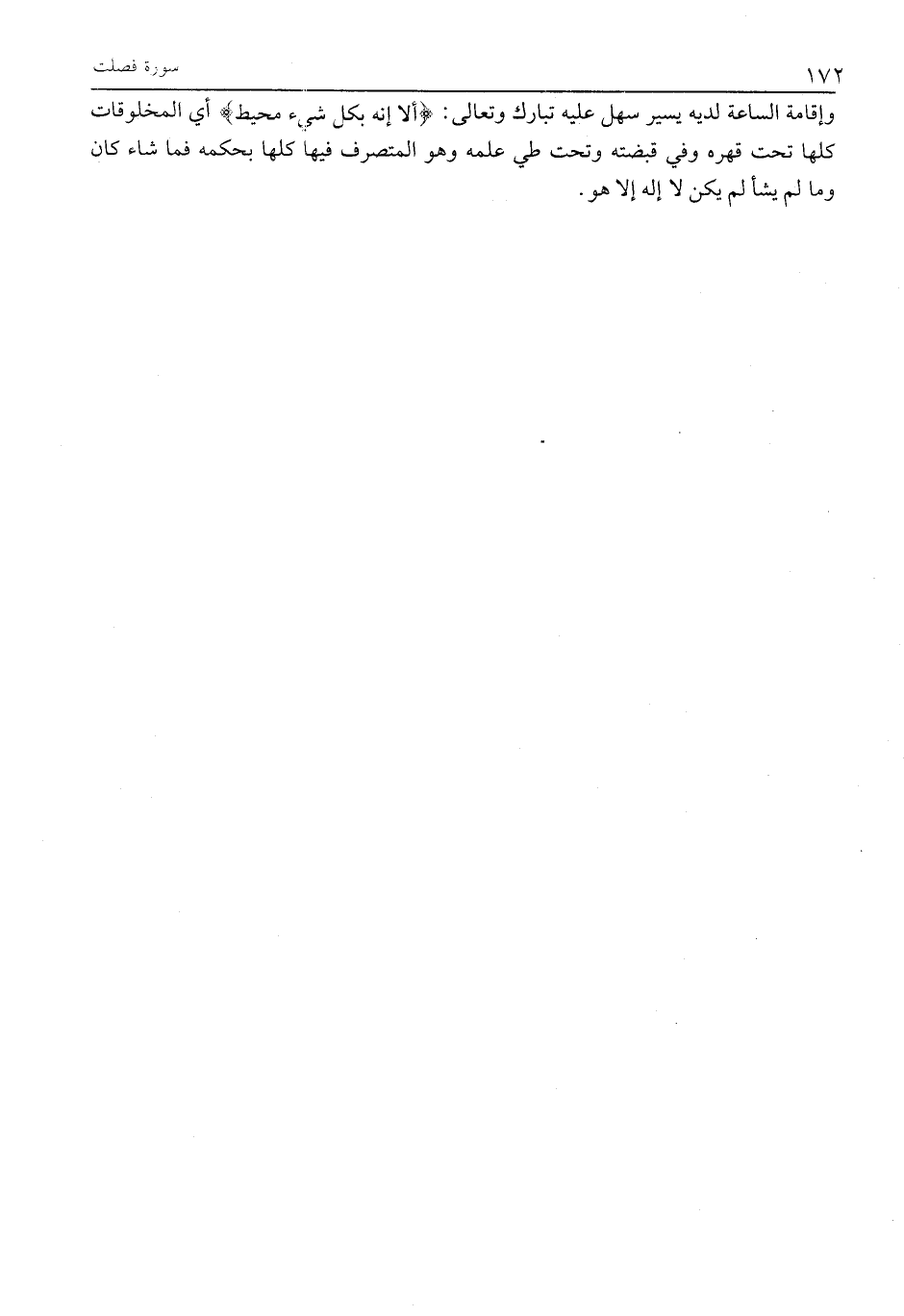 وَإِقَامَةُ السَّاعَةِ لَدَيْهِ يَسِيرٌ سَهْلٌ عَلَيْهِ تَبَارَكَ وَتَعَالَى: أَلا إِنَّهُ بِكُلِّ شَيْءٍ مُحِيطٌ أَيِ الْمَخْلُوقَاتُ كُلُّهَا تَحْتَ قَهْرِهِ وَفِي قَبْضَتِهِ وَتَحْتَ طَيِّ عِلْمِهِ وَهُوَ الْمُتَصَرِّفُ فِيهَا كُلِّهَا بِحُكْمِهِ فَمَا شَاءَ كَانَ وَمَا لَمْ يَشَأْ لَمْ يَكُنْ لا إله إلا هو.