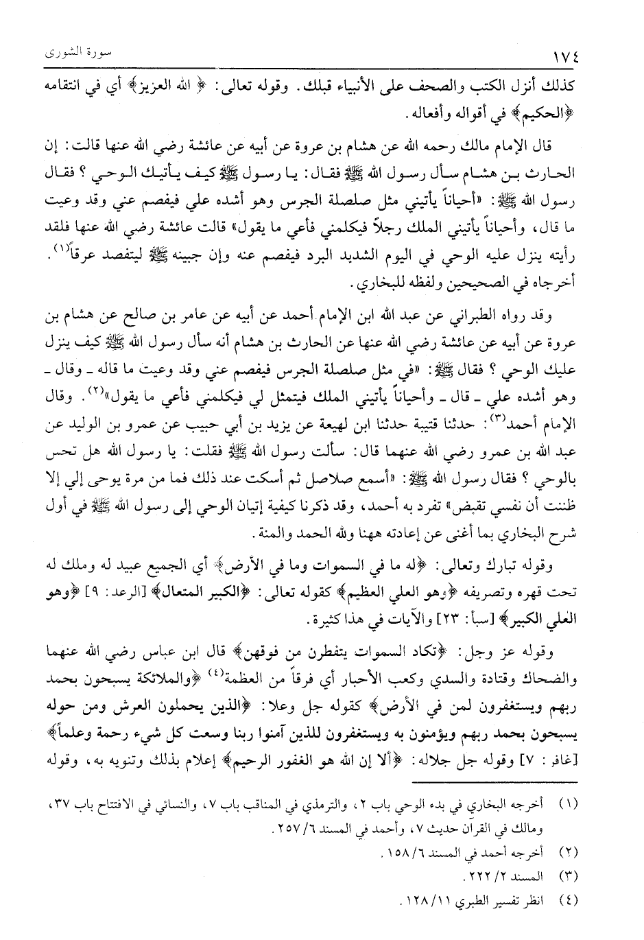 قَالَ الْإِمَامُ مَالِكٌ رَحِمَهُ اللَّهِ عَنْ هِشَامِ بْنِ عُرْوَةَ عَنْ أَبِيهِ عَنْ عائشة رضي الله عنها قالت: أَنَّ الْحَارِثَ بْنَ هِشَامٍ سَأَلَ رَسُولَ اللَّهِ صَلَّى اللَّهُ عَلَيْهِ وَسَلَّمَ فَقَالَ: يَا رَسُولَ صَلَّى اللَّهُ عَلَيْهِ وَسَلَّمَ كَيْفَ يَأْتِيكَ الْوَحْيُ؟ فَقَالَ رَسُولُ اللَّهِ صَلَّى اللَّهُ عَلَيْهِ وَسَلَّمَ: «أَحْيَانًا يَأْتِينِي مِثْلَ صَلْصَلَةِ الْجَرَسِ وَهُوَ أَشَدُّهُ عَلَيَّ فَيَفْصِمُ عني وقد وَعَيْتُ مَا قَالَ، وَأَحْيَانًا يَأْتِينِي الْمَلَكُ رَجُلًا فَيُكَلِّمُنِي فَأَعِي مَا يَقُولُ» قَالَتْ عائشة رضي الله عنها فَلَقَدْ رَأَيْتُهُ يَنْزِلُ عَلَيْهِ الْوَحْيُ فِي الْيَوْمِ الشَّدِيدِ الْبَرْدِ فَيَفْصِمُ عَنْهُ وَإِنَّ جبينه صلى الله عليه وسلم لِيَتَفَصَّدُ عَرَقًا «1» .