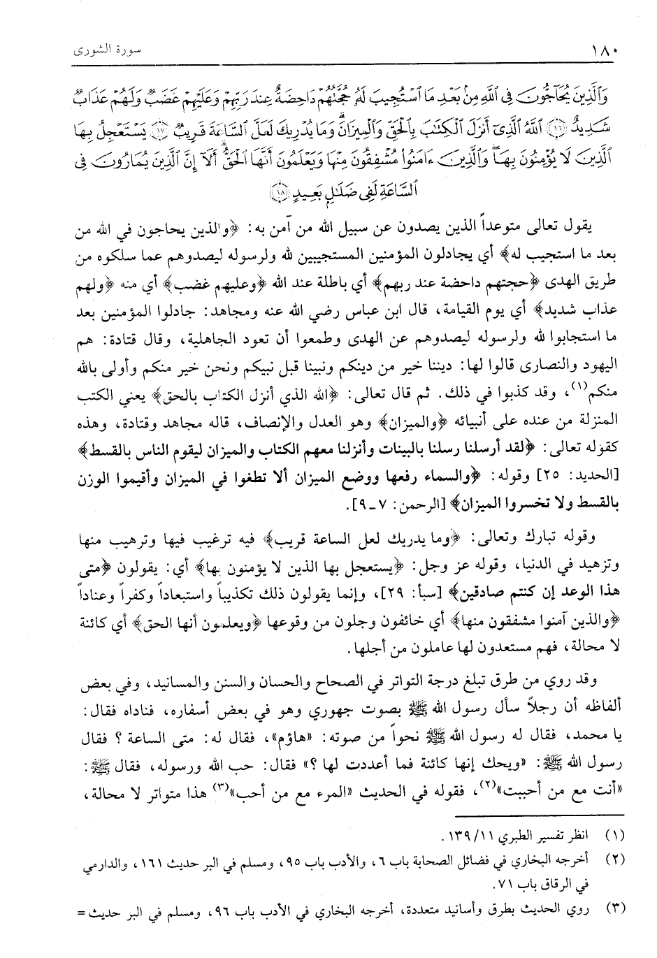 وَالَّذِينَ يُحَاجُّونَ فِي اللَّهِ مِنْ بَعْدِ مَا اسْتُجِيبَ لَهُ حُجَّتُهُمْ داحِضَةٌ عِنْدَ رَبِّهِمْ وَعَلَيْهِمْ غَضَبٌ وَلَهُمْ عَذابٌ شَدِيدٌ (16) اللَّهُ الَّذِي أَنْزَلَ الْكِتابَ بِالْحَقِّ وَالْمِيزانَ وَما يُدْرِيكَ لَعَلَّ السَّاعَةَ قَرِيبٌ (17) يَسْتَعْجِلُ بِهَا الَّذِينَ لَا يُؤْمِنُونَ بِها وَالَّذِينَ آمَنُوا مُشْفِقُونَ مِنْها وَيَعْلَمُونَ أَنَّهَا الْحَقُّ أَلا إِنَّ الَّذِينَ يُمارُونَ فِي السَّاعَةِ لَفِي ضَلالٍ بَعِيدٍ (18)
