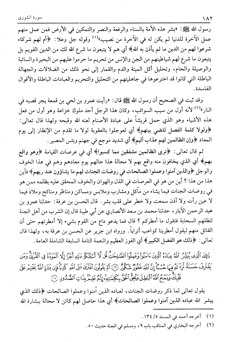 رَسُولُ اللَّهِ صَلَّى اللَّهُ عَلَيْهِ وَسَلَّمَ: «بَشِّرْ هَذِهِ الْأُمَّةَ بِالسَّنَاءِ وَالرِّفْعَةِ وَالنَّصْرِ وَالتَّمْكِينِ فِي الْأَرْضِ فَمِنْ عَمِلَ مِنْهُمْ عَمَلَ الْآخِرَةِ لِلدُّنْيَا لَمْ يَكُنْ لَهُ فِي الْآخِرَةِ مِنْ نَصِيبٍ» «1» وقوله جل وعلا: أَمْ لَهُمْ شُرَكاءُ شَرَعُوا لَهُمْ مِنَ الدِّينِ مَا لَمْ يَأْذَنْ بِهِ اللَّهُ أَيْ هُمْ لَا يَتَّبِعُونَ مَا شَرَعَ اللَّهُ لَكَ مِنَ الدِّينِ الْقَوِيمِ بَلْ يَتَّبِعُونَ مَا شَرَعَ لَهُمْ شَيَاطِينُهُمْ مِنَ الْجِنِّ وَالْإِنْسِ مِنْ تَحْرِيمِ مَا حَرَّمُوا عَلَيْهِمْ مِنَ الْبَحِيرَةِ وَالسَّائِبَةِ وَالْوَصِيلَةِ وَالْحَامِ، وتحليل أكل الْمَيْتَةِ وَالدَّمِ وَالْقِمَارِ إِلَى نَحْوِ ذَلِكَ مِنَ الضَّلَالَاتِ وَالْجَهَالَةِ الْبَاطِلَةِ الَّتِي كَانُوا قَدِ اخْتَرَعُوهَا فِي جَاهِلِيَّتِهِمْ مِنَ التَّحْلِيلِ وَالتَّحْرِيمِ وَالْعِبَادَاتِ الْبَاطِلَةِ وَالْأَقْوَالِ الْفَاسِدَةِ.