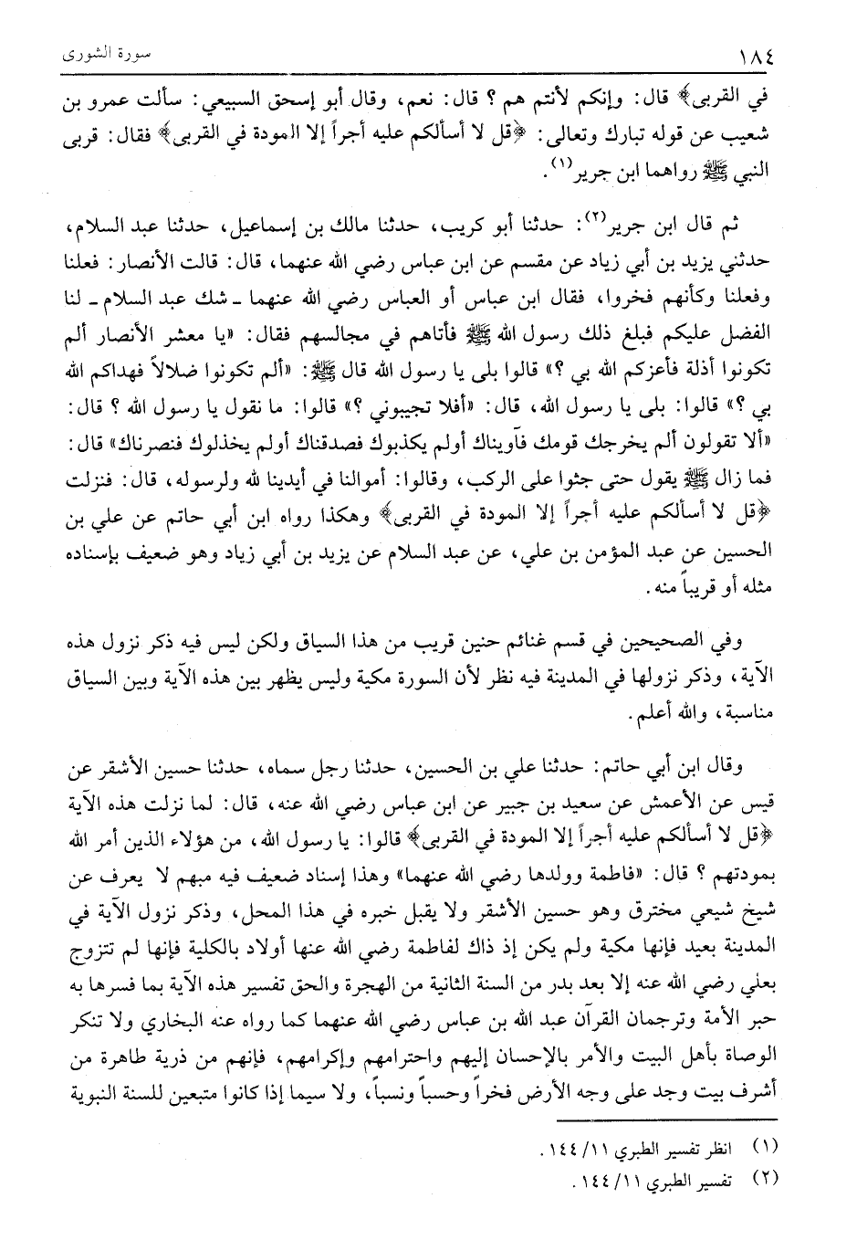 قال: وإنكم لأنتم هُمْ؟ قَالَ: نَعَمْ، وَقَالَ أَبُو إِسْحَاقَ السَّبِيعِيُّ: سألت عمرو بن شعيب عن قوله تبارك وتعالى: قُلْ لا أَسْئَلُكُمْ عَلَيْهِ أَجْراً إِلَّا الْمَوَدَّةَ فِي الْقُرْبى فَقَالَ: قُرْبَى النَّبِيِّ صَلَّى اللَّهُ عَلَيْهِ وَسَلَّمَ رَوَاهُمَا ابْنُ جَرِيرٍ «1» .