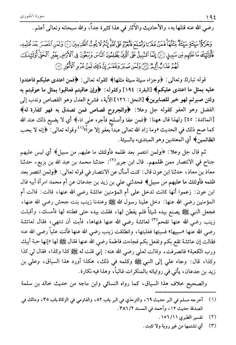 وَجَزاءُ سَيِّئَةٍ سَيِّئَةٌ مِثْلُها فَمَنْ عَفا وَأَصْلَحَ فَأَجْرُهُ عَلَى اللَّهِ إِنَّهُ لَا يُحِبُّ الظَّالِمِينَ (40) وَلَمَنِ انْتَصَرَ بَعْدَ ظُلْمِهِ فَأُولئِكَ مَا عَلَيْهِمْ مِنْ سَبِيلٍ (41) إِنَّمَا السَّبِيلُ عَلَى الَّذِينَ يَظْلِمُونَ النَّاسَ وَيَبْغُونَ فِي الْأَرْضِ بِغَيْرِ الْحَقِّ أُولئِكَ لَهُمْ عَذابٌ أَلِيمٌ (42) وَلَمَنْ صَبَرَ وَغَفَرَ إِنَّ ذلِكَ لَمِنْ عَزْمِ الْأُمُورِ (43)