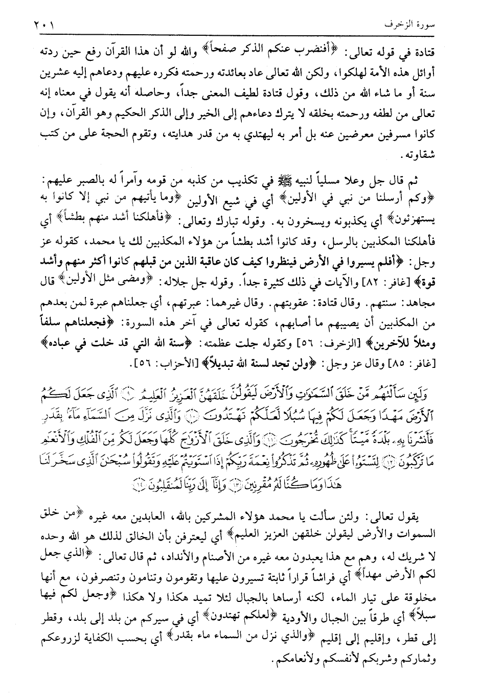 وَلَئِنْ سَأَلْتَهُمْ مَنْ خَلَقَ السَّماواتِ وَالْأَرْضَ لَيَقُولُنَّ خَلَقَهُنَّ الْعَزِيزُ الْعَلِيمُ (9) الَّذِي جَعَلَ لَكُمُ الْأَرْضَ مَهْداً وَجَعَلَ لَكُمْ فِيها سُبُلاً لَعَلَّكُمْ تَهْتَدُونَ (10) وَالَّذِي نَزَّلَ مِنَ السَّماءِ مَاءً بِقَدَرٍ فَأَنْشَرْنا بِهِ بَلْدَةً مَيْتاً كَذلِكَ تُخْرَجُونَ (11) وَالَّذِي خَلَقَ الْأَزْواجَ كُلَّها وَجَعَلَ لَكُمْ مِنَ الْفُلْكِ وَالْأَنْعامِ مَا تَرْكَبُونَ (12) لِتَسْتَوُوا عَلى ظُهُورِهِ ثُمَّ تَذْكُرُوا نِعْمَةَ رَبِّكُمْ إِذَا اسْتَوَيْتُمْ عَلَيْهِ وَتَقُولُوا سُبْحانَ الَّذِي سَخَّرَ لَنا هَذَا وَما كُنَّا لَهُ مُقْرِنِينَ (13)