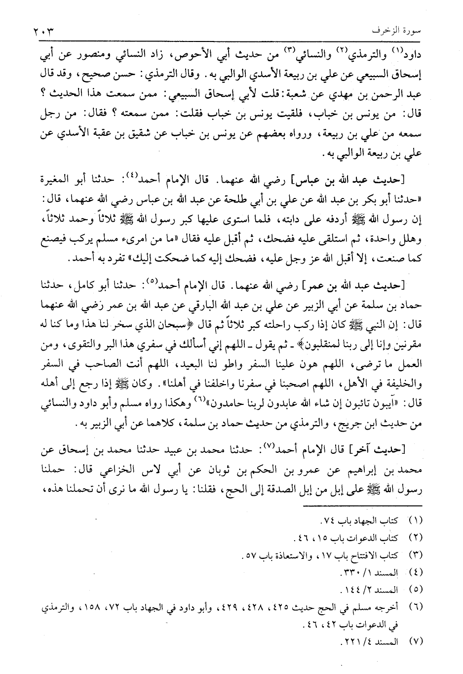 [حَدِيثُ عَبْدِ اللَّهِ بْنِ عُمَرَ] رَضِيَ اللَّهُ عَنْهُمَا. قَالَ الْإِمَامُ أَحْمَدُ «5» : حَدَّثَنَا أَبُو كَامِلٍ، حَدَّثَنَا حَمَّادٌ بْنُ سَلَمَةَ عَنْ أَبِي الزُّبَيْرِ عَنْ عَلِيِّ بْنِ عَبْدِ اللَّهِ الْبَارِقِيِّ عَنْ عَبْدِ اللَّهِ بْنِ عُمَرَ رَضِيَ اللَّهُ عنهما قَالَ: أَنَّ النَّبِيَّ صَلَّى اللَّهُ عَلَيْهِ وَسَلَّمَ كَانَ إِذَا رَكِبَ رَاحِلَتَهُ كَبَّرَ ثَلَاثًا ثُمَّ قَالَ سُبْحانَ الَّذِي سَخَّرَ لَنا هَذَا وَما كُنَّا لَهُ مُقْرِنِينَ وَإِنَّا إِلى رَبِّنا لَمُنْقَلِبُونَ- ثُمَّ يَقُولُ- اللَّهُمَّ إِنِّي أَسْأَلُكَ فِي سَفَرِي هَذَا الْبِرَّ وَالتَّقْوَى، وَمِنَ الْعَمَلِ مَا تَرْضَى، اللَّهُمَّ هَوِّنْ عَلَيْنَا السَّفَرَ وَاطْوِ لَنَا الْبَعِيدَ، اللَّهُمَّ أَنْتَ الصَّاحِبُ فِي السَّفَرِ وَالْخَلِيفَةُ فِي الْأَهْلِ، اللَّهُمَّ اصْحَبْنَا فِي سَفَرِنَا وَاخْلُفْنَا فِي أهلنا» . وكان صلى الله عليه وسلم إذا رجع إلى أهله قال: «آئبون تَائِبُونَ إِنْ شَاءَ اللَّهُ عَابِدُونَ لِرَبِّنَا حَامِدُونَ» «6» وَهَكَذَا رَوَاهُ مُسْلِمٌ وَأَبُو دَاوُدَ وَالنَّسَائِيُّ مِنْ حَدِيثِ ابْنِ جُرَيْجٍ، وَالتِّرْمِذِيُّ مِنْ حَدِيثِ حَمَّادِ بْنِ سَلَمَةَ، كِلَاهُمَا عَنْ أَبِي الزُّبَيْرِ بِهِ.