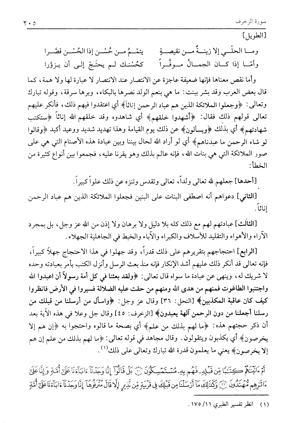 وَأَمَّا نَقْصُ مَعْنَاهَا فَإِنَّهَا ضَعِيفَةٌ عَاجِزَةٌ عَنِ الِانْتِصَارِ عِنْدَ الِانْتِصَارِ لَا عِبَارَةَ لَهَا وَلَا هِمَّةَ، كَمَا قَالَ بَعْضُ الْعَرَبِ وَقَدْ بُشِّرَ بِبِنْتٍ: مَا هِيَ بِنِعْمَ الْوَلَدِ نصرها بالبكاء، وبرها سرقة، وقوله تبارك وتعالى: وَجَعَلُوا الْمَلائِكَةَ الَّذِينَ هُمْ عِبادُ الرَّحْمنِ إِناثاً أَيِ اعْتَقَدُوا فِيهِمْ ذَلِكَ، فَأَنْكَرَ عَلَيْهِمْ تَعَالَى قَوْلَهُمْ ذَلِكَ فَقَالَ: أَشَهِدُوا خَلْقَهُمْ أَيْ شَاهَدُوهُ وَقَدْ خَلَقَهُمُ اللَّهُ إِنَاثًا سَتُكْتَبُ شَهادَتُهُمْ أَيْ بذلك وَيُسْئَلُونَ عَنْ ذَلِكَ يَوْمَ الْقِيَامَةِ وَهَذَا تَهْدِيدٌ شَدِيدٌ وَوَعِيدٌ أَكِيدٌ وَقالُوا لَوْ شاءَ الرَّحْمنُ مَا عَبَدْناهُمْ أَيْ لَوْ أَرَادَ اللَّهُ لَحَالَ بَيْنَنَا وَبَيْنَ عِبَادَةِ هَذِهِ الْأَصْنَامِ الَّتِي هِيَ عَلَى صُوَرِ الْمَلَائِكَةِ الَّتِي هِيَ بَنَاتُ اللَّهِ، فَإِنَّهُ عالم بذلك وهو يقرنا عَلَيْهِ، فَجَمَعُوا بَيْنَ أَنْوَاعٍ كَثِيرَةٍ مِنَ الْخَطَأِ: