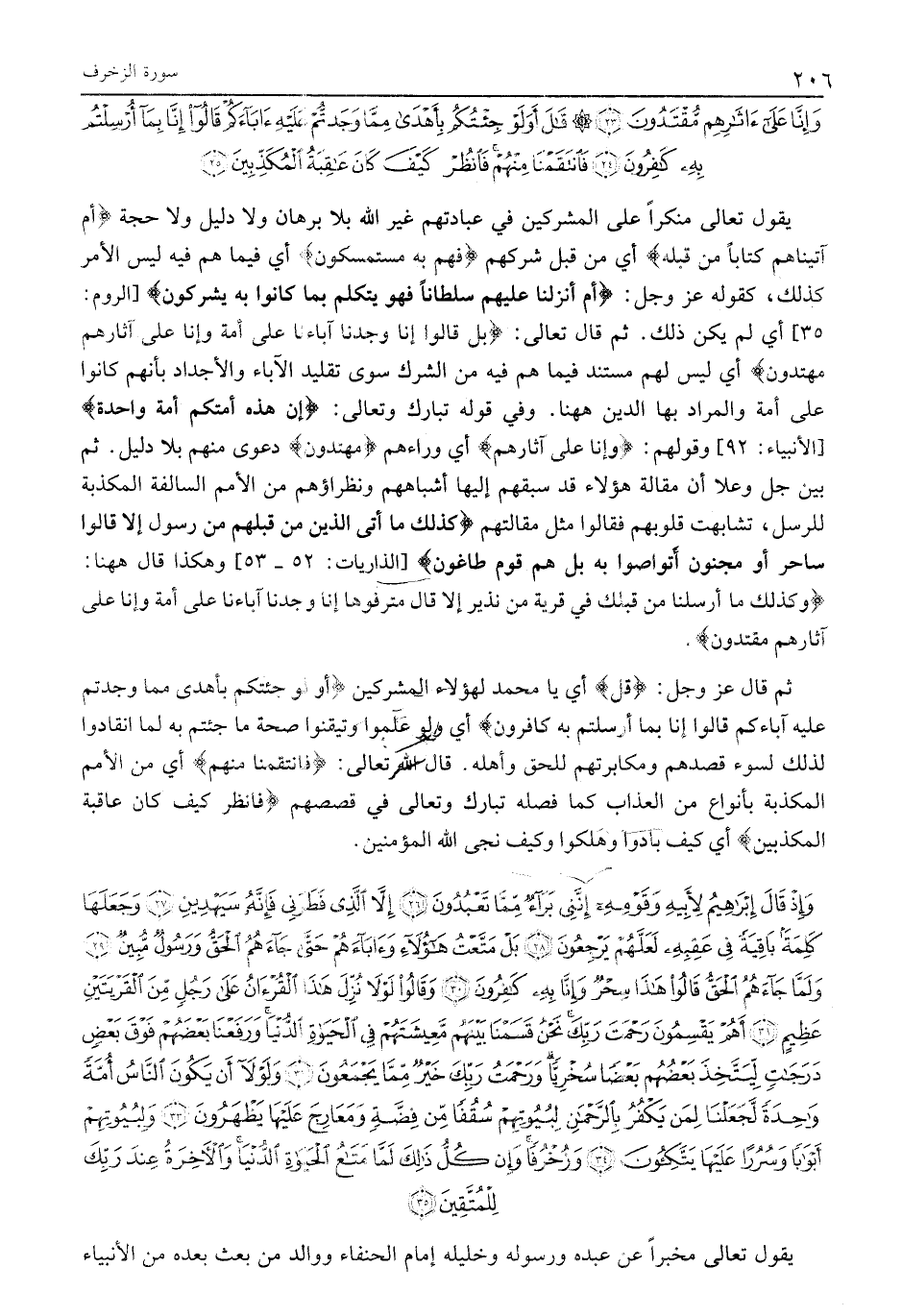 35] أَيْ لَمْ يَكُنْ ذلك. ثم قال تعالى: بَلْ قالُوا إِنَّا وَجَدْنا آباءَنا عَلى أُمَّةٍ وَإِنَّا عَلى آثارِهِمْ مُهْتَدُونَ أَيْ لَيْسَ لَهُمْ مُسْتَنَدٌ فِيمَا هُمْ فِيهِ مِنَ الشِّرْكِ سِوَى تَقْلِيدِ الْآبَاءِ وَالْأَجْدَادِ بِأَنَّهُمْ كَانُوا عَلَى أُمَّةٍ والمراد بها الدين هاهنا. وفي قوله تبارك وتعالى: إِنَّ هذِهِ أُمَّتُكُمْ أُمَّةً واحِدَةً [الْأَنْبِيَاءِ: 92] وَقَوْلُهُمْ: وَإِنَّا عَلى آثارِهِمْ أي وراءهم مُهْتَدُونَ دَعْوَى مِنْهُمْ بِلَا دَلِيلٍ. ثُمَّ بَيَّنَ جل وعلا أَنَّ مَقَالَةَ هَؤُلَاءِ قَدْ سَبَقَهُمْ إِلَيْهَا أَشْبَاهُهُمْ وَنُظَرَاؤُهُمْ مِنَ الْأُمَمِ السَّالِفَةِ الْمُكَذِّبَةِ لِلرُّسُلِ، تَشَابَهَتْ قُلُوبُهُمْ فَقَالُوا مِثْلَ مَقَالَتِهِمْ كَذلِكَ مَا أَتَى الَّذِينَ مِنْ قَبْلِهِمْ مِنْ رَسُولٍ إِلَّا قالُوا ساحِرٌ أَوْ مَجْنُونٌ أَتَواصَوْا بِهِ بَلْ هُمْ قَوْمٌ طاغُونَ [الذَّارِيَاتِ: 52- 53] وَهَكَذَا قَالَ هَاهُنَا: