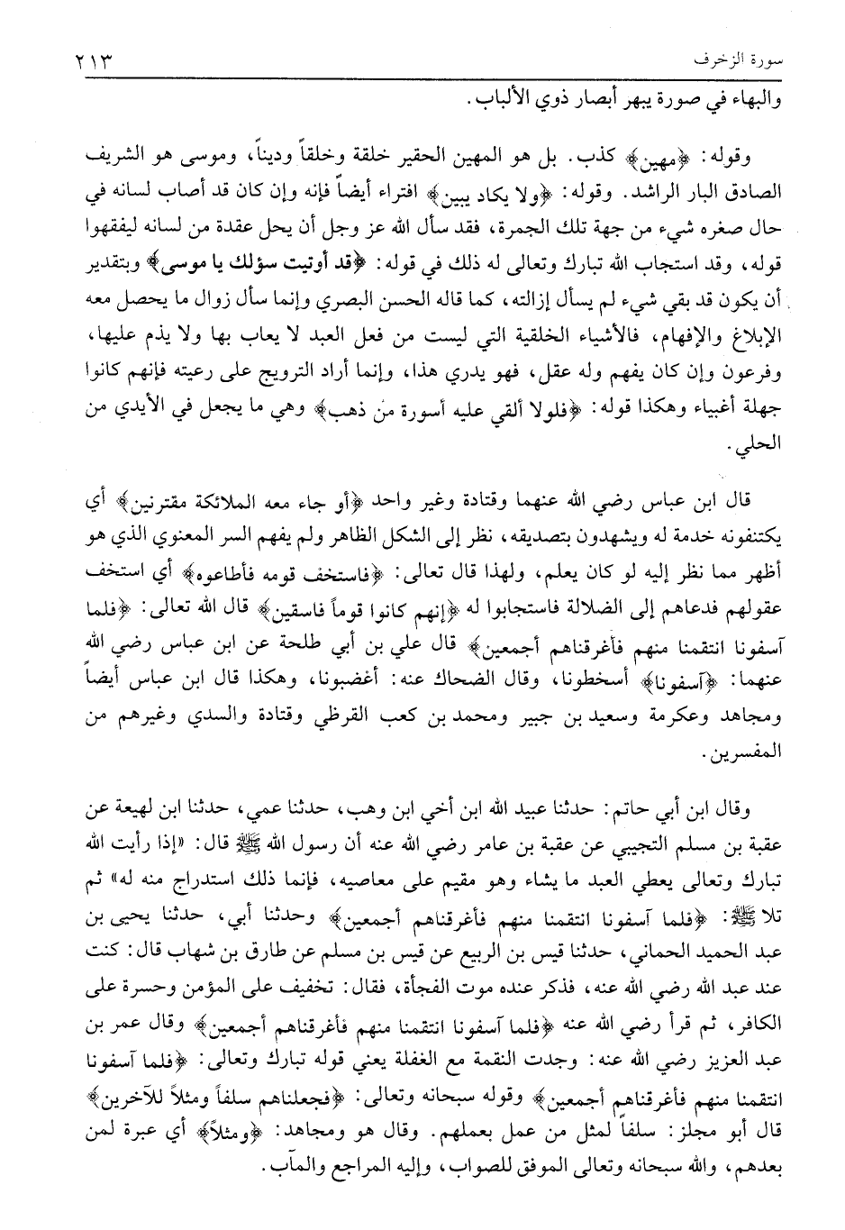 وَقَالَ ابْنُ أَبِي حاتم: حدثنا عُبَيْدِ اللَّهِ ابْنِ أَخِي ابْنِ وَهْبٍ، حَدَّثَنَا عَمِّي، حَدَّثَنَا ابْنُ لَهِيعَةَ عَنْ عُقْبَةَ بْنِ مسلم التجيبي عَنْ عُقْبَةَ بْنِ عَامِرٍ رَضِيَ اللَّهُ عَنْهُ أَنَّ رَسُولَ اللَّهِ صَلَّى اللَّهُ عَلَيْهِ وَسَلَّمَ قَالَ: «إِذَا رَأَيْتَ اللَّهَ تبارك وتعالى يعطي العبد ما يشاء وَهُوَ مُقِيمٌ عَلَى مَعَاصِيهِ، فَإِنَّمَا ذَلِكَ اسْتِدْرَاجٌ منه له» ثم تلا صلى الله عليه وسلم: فَلَمَّا آسَفُونا انْتَقَمْنا مِنْهُمْ فَأَغْرَقْناهُمْ أَجْمَعِينَ وَحَدَّثَنَا أَبِي، حَدَّثَنَا يَحْيَى بْنُ عَبْدِ الْحَمِيدِ الْحِمَّانِيُّ، حَدَّثَنَا قَيْسُ بْنُ الرَّبِيعِ عَنْ قَيْسِ بْنِ مُسْلِمٍ عَنْ طَارِقِ بْنِ شِهَابٍ قَالَ: كنت عند عبد الله رضي الله عنه، فَذُكِرَ عِنْدَهُ مَوْتُ الْفَجْأَةِ، فَقَالَ: تَخْفِيفٌ عَلَى المؤمن وحسرة على الكافر، ثم قرأ رضي الله عنه فَلَمَّا آسَفُونا انْتَقَمْنا مِنْهُمْ فَأَغْرَقْناهُمْ أَجْمَعِينَ وَقَالَ عُمَرَ بْنِ عَبْدِ الْعَزِيزِ رَضِيَ اللَّهُ عَنْهُ: وَجَدْتُ النِّقْمَةَ مَعَ الْغَفْلَةِ يَعْنِي قَوْلَهُ تبارك وتعالى: فَلَمَّا آسَفُونا انْتَقَمْنا مِنْهُمْ فَأَغْرَقْناهُمْ أَجْمَعِينَ وَقَوْلُهُ سبحانه وتعالى: فَجَعَلْناهُمْ سَلَفاً وَمَثَلًا لِلْآخِرِينَ قَالَ أَبُو مِجْلَزٍ: سَلَفًا لِمِثْلِ مَنْ عَمِلَ بِعَمَلِهِمْ. وَقَالَ هُوَ ومجاهد: وَمَثَلًا أي عبرة لمن بعدهم، والله سبحانه وتعالى الموفق للصواب، وإليه المراجع والمآب.