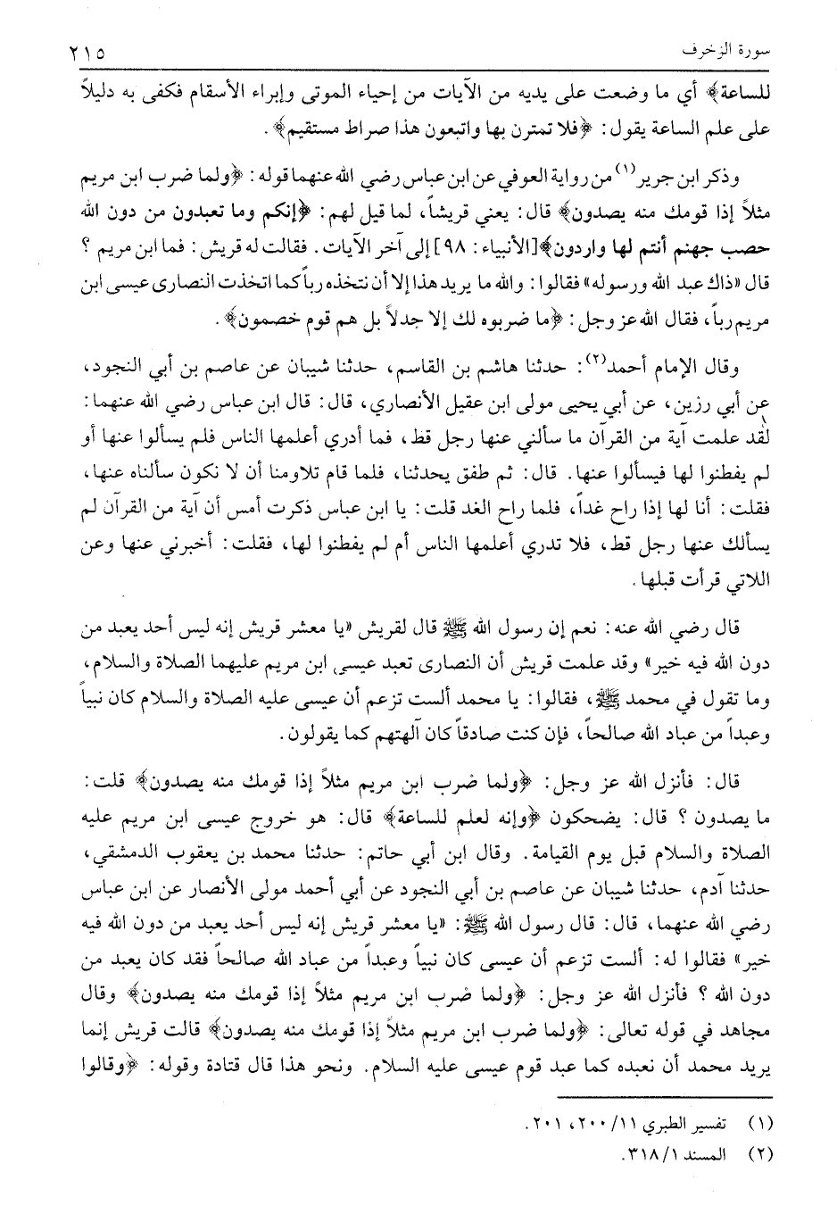 مَا يَصِدُّونَ؟ قَالَ: يَضْحَكُونَ وَإِنَّهُ لَعِلْمٌ لِلسَّاعَةِ قال: هو خروج عيسى ابن مريم عليه الصلاة والسلام قبل يَوْمَ الْقِيَامَةِ. وَقَالَ ابْنُ أَبِي حَاتِمٍ: حَدَّثَنَا مُحَمَّدُ بْنُ يَعْقُوبَ الدِّمَشْقِيُّ، حَدَّثَنَا آدَمُ، حَدَّثَنَا شَيْبَانَ عَنْ عَاصِمِ بْنِ أَبِي النَّجُودِ عَنْ أَبِي أحمد مولى الأنصار عَنِ ابْنِ عَبَّاسٍ رَضِيَ اللَّهُ عَنْهُمَا، قَالَ: قَالَ رَسُولُ اللَّهِ صَلَّى اللَّهُ عَلَيْهِ وَسَلَّمَ: «يَا مَعْشَرَ قُرَيْشٍ إِنَّهُ لَيْسَ أَحَدٌ يُعْبَدُ مِنْ دُونِ اللَّهِ فِيهِ خَيْرٌ» فَقَالُوا لَهُ: أَلَسْتَ تَزْعُمُ أَنَّ عِيسَى كَانَ نَبِيًّا وَعَبْدًا مِنْ عِبَادِ اللَّهِ صَالِحًا فَقَدْ كَانَ يُعْبَدُ مِنْ دُونِ اللَّهِ؟ فَأَنْزَلَ اللَّهُ عَزَّ وَجَلَّ: وَلَمَّا ضُرِبَ ابْنُ مَرْيَمَ مَثَلًا إِذا قَوْمُكَ مِنْهُ يَصِدُّونَ وقال مجاهد في قوله تعالى: وَلَمَّا ضُرِبَ ابْنُ مَرْيَمَ مَثَلًا إِذا قَوْمُكَ مِنْهُ يَصِدُّونَ قَالَتْ قُرَيْشٌ إِنَّمَا يُرِيدُ مُحَمَّدٌ أن نعبده كما عبد قوم عيسى عليه السلام. ونحو هذا قال قتادة وقوله:
