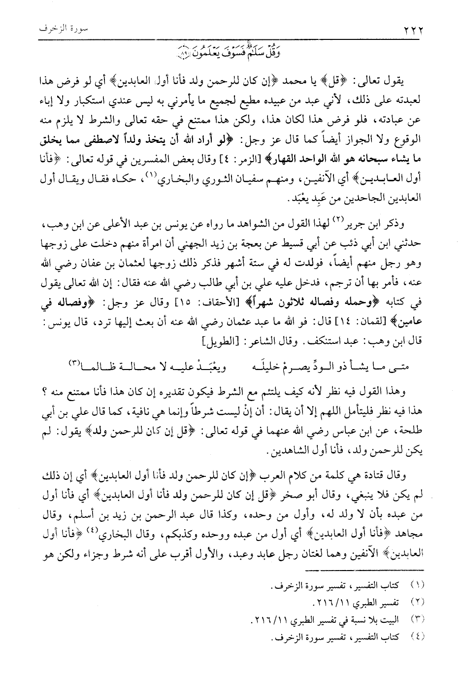 وَقَالَ قتادة هي كلمة من كلام العرب إِنْ كانَ لِلرَّحْمنِ وَلَدٌ فَأَنَا أَوَّلُ الْعابِدِينَ أَيْ إِنْ ذَلِكَ لَمْ يَكُنْ فَلَا يَنْبَغِي، وَقَالَ أَبُو صَخْرٍ قُلْ إِنْ كانَ لِلرَّحْمنِ وَلَدٌ فَأَنَا أَوَّلُ الْعابِدِينَ أَيْ فَأَنَا أَوَّلُ مَنْ عَبَدَهُ بِأَنْ لَا وَلَدَ لَهُ، وَأَوَّلُ مَنْ وَحَّدَهُ، وَكَذَا قَالَ عَبْدُ الرَّحْمَنِ بْنُ زَيْدِ بْنِ أَسْلَمَ، وَقَالَ مُجَاهِدٌ فَأَنَا أَوَّلُ الْعابِدِينَ أَيْ أَوَّلُ مَنْ عَبَدَهُ وَوَحَّدَهُ وَكَذَّبَكُمْ، وَقَالَ الْبُخَارِيُّ «4» فَأَنَا أَوَّلُ الْعابِدِينَ الْآنِفِينَ وَهُمَا لُغَتَانِ رَجُلٌ عَابِدٌ وَعَبِدٌ، وَالْأَوَّلُ أَقْرَبُ عَلَى أنه شرط وجزاء ولكن هو