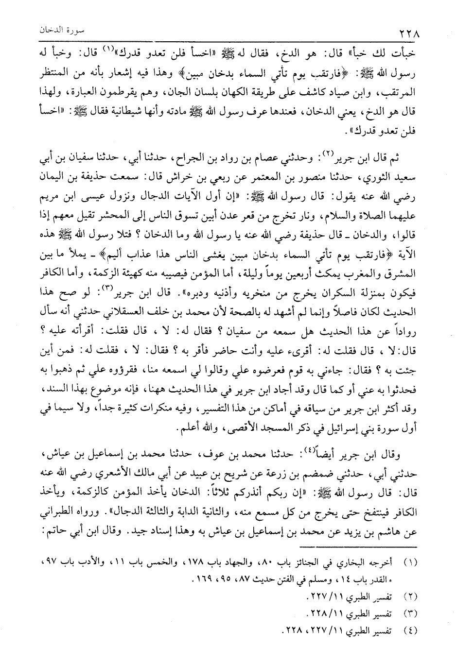 ثُمَّ قَالَ ابْنُ جَرِيرٍ «2» : وَحَدَّثَنِي عِصَامُ بْنُ رَوَّادِ بْنِ الْجَرَّاحِ، حدثنا أبي، حدثنا سفيان بن أبي سَعِيدٍ الثَّوْرِيُّ، حَدَّثَنَا مَنْصُورُ بْنُ الْمُعْتَمِرِ عَنْ ربعي بن خراش قال: سمعت حذيفة بن اليمان رَضِيَ اللَّهُ عَنْهُ يَقُولُ: قَالَ رَسُولُ اللَّهِ صَلَّى اللَّهُ عَلَيْهِ وَسَلَّمَ: «إِنَّ أَوَّلَ الْآيَاتِ الدَّجَّالُ وَنُزُولُ عِيسَى ابن مريم عليهما الصلاة والسلام، وَنَارٌ تَخْرُجُ مِنْ قَعْرِ عَدَنَ أَبْيَنُ تَسُوقُ النَّاسَ إِلَى الْمَحْشَرِ تَقِيلُ مَعَهُمْ إِذَا قَالُوا، والدخان- قال حذيفة رضي الله عنه يَا رَسُولَ اللَّهِ وَمَا الدُّخَانُ؟ فَتَلَا رَسُولُ اللَّهِ صَلَّى اللَّهُ عَلَيْهِ وَسَلَّمَ هَذِهِ الْآيَةَ فَارْتَقِبْ يَوْمَ تَأْتِي السَّماءُ بِدُخانٍ مُبِينٍ يَغْشَى النَّاسَ هَذَا عَذابٌ أَلِيمٌ- يَمْلَأُ مَا بَيْنَ الْمَشْرِقِ وَالْمَغْرِبِ يَمْكُثُ أَرْبَعِينَ يَوْمًا وَلَيْلَةً، أَمَّا الْمُؤْمِنُ فَيُصِيبُهُ مِنْهُ كَهَيْئَةِ الزُّكْمَةِ، وَأَمَّا الْكَافِرُ فَيَكُونُ بِمَنْزِلَةِ السَّكْرَانِ يَخْرُجُ مِنْ مَنْخِرَيْهِ وَأُذُنَيْهِ وَدُبُرِهِ» . قَالَ ابْنُ جَرِيرٍ «3» : لَوْ صَحَّ هَذَا الْحَدِيثُ لَكَانَ فَاصِلًا وَإِنَّمَا لَمْ أَشْهَدْ لَهُ بِالصِّحَّةِ لَأَنَّ مُحَمَّدَ بْنَ خَلَفٍ الْعَسْقَلَانِيَّ حَدَّثَنِي أَنَّهُ سَأَلَ رَوَّادًا عَنْ هَذَا الْحَدِيثِ هَلْ سَمِعَهُ مِنْ سُفْيَانَ؟ فَقَالَ لَهُ: لَا، قَالَ فَقُلْتُ: أَقَرَأْتَهُ عَلَيْهِ؟