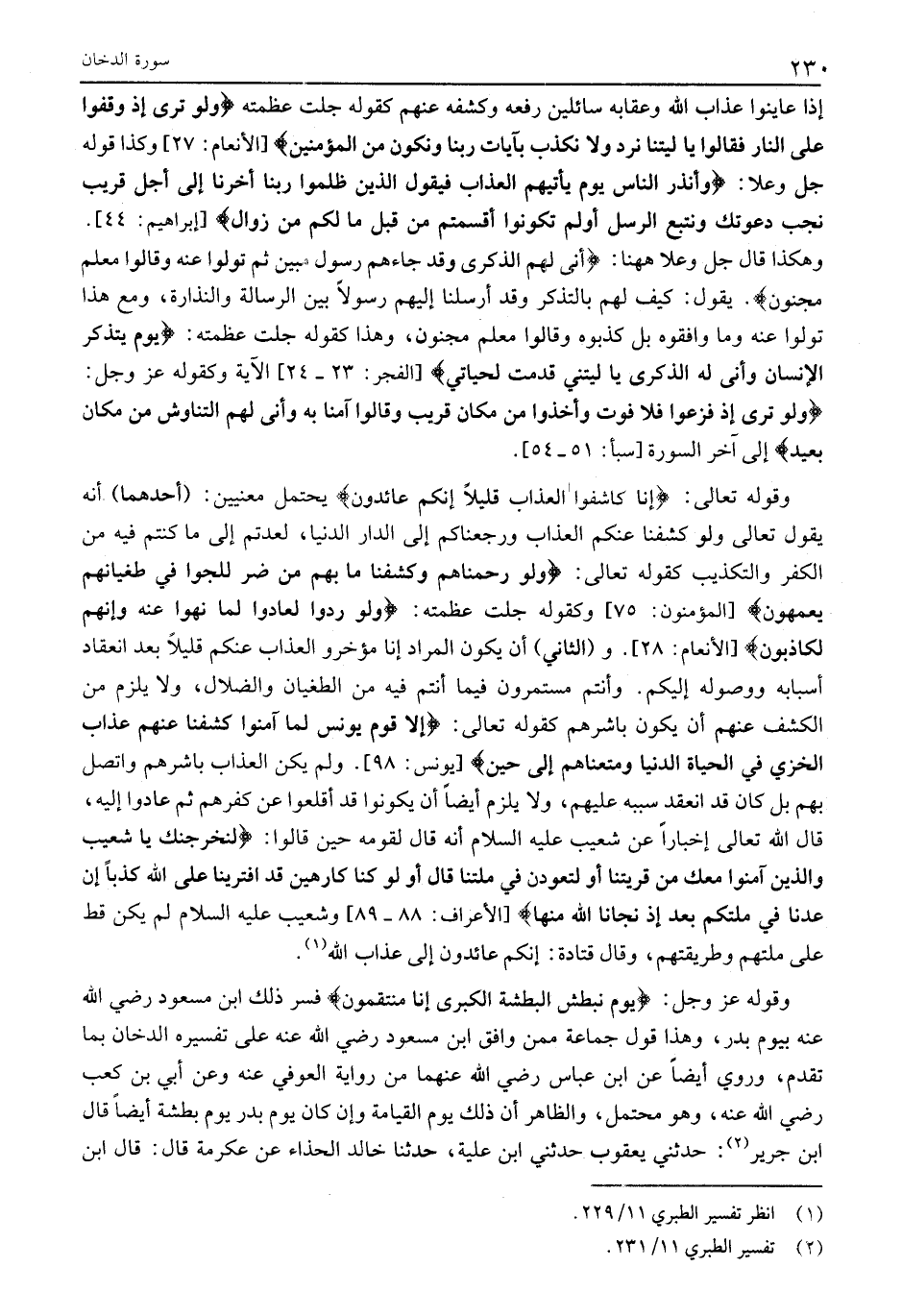 وقوله عز وجل: يَوْمَ نَبْطِشُ الْبَطْشَةَ الْكُبْرى إِنَّا مُنْتَقِمُونَ فَسَّرَ ذلك ابن مسعود رضي الله عنه بِيَوْمِ بَدْرٍ، وَهَذَا قَوْلُ جَمَاعَةٍ مِمَّنْ وَافَقَ ابن مسعود رضي الله عنه عَلَى تَفْسِيرِهِ الدُّخَانَ بِمَا تَقَدَّمَ، وَرُوِيَ أَيْضًا عن ابن عباس رضي الله عنهما مِنْ رِوَايَةِ الْعَوْفِيِّ عَنْهُ وَعَنْ أُبَيِّ بْنِ كعب رضي الله عنه، وَهُوَ مُحْتَمَلٌ، وَالظَّاهِرُ أَنَّ ذَلِكَ يَوْمُ الْقِيَامَةِ وَإِنْ كَانَ يَوْمُ بَدْرٍ يَوْمَ بَطْشَةٍ أَيْضًا قال ابْنُ جَرِيرٍ «2» : حَدَّثَنِي يَعْقُوبُ حَدَّثَنِي ابْنُ عُلَيَّةَ، حَدَّثَنَا خَالِدٌ الْحَذَّاءُ عَنْ عِكْرِمَةَ قال: قال ابن