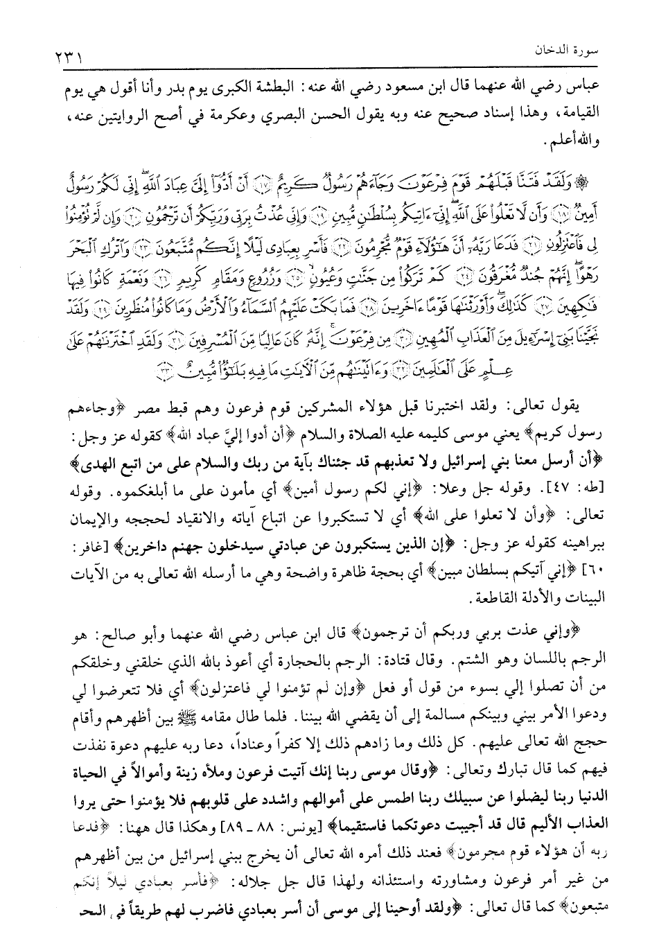 وَلَقَدْ فَتَنَّا قَبْلَهُمْ قَوْمَ فِرْعَوْنَ وَجاءَهُمْ رَسُولٌ كَرِيمٌ (17) أَنْ أَدُّوا إِلَيَّ عِبادَ اللَّهِ إِنِّي لَكُمْ رَسُولٌ أَمِينٌ (18) وَأَنْ لا تَعْلُوا عَلَى اللَّهِ إِنِّي آتِيكُمْ بِسُلْطانٍ مُبِينٍ (19) وَإِنِّي عُذْتُ بِرَبِّي وَرَبِّكُمْ أَنْ تَرْجُمُونِ (20) وَإِنْ لَمْ تُؤْمِنُوا لِي فَاعْتَزِلُونِ (21)