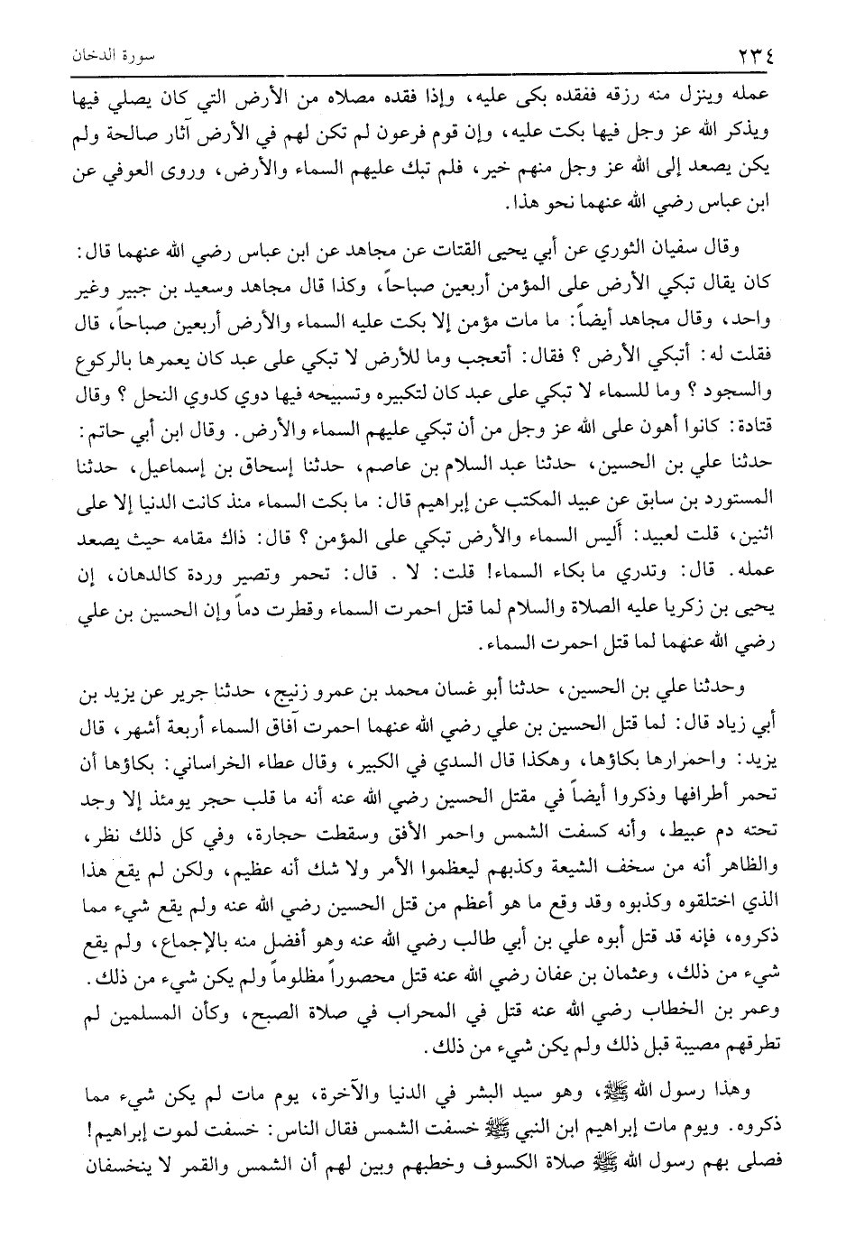 وَحَدَّثَنَا عَلِيُّ بْنُ الْحُسَيْنِ، حَدَّثَنَا أَبُو غَسَّانَ مُحَمَّدُ بْنُ عَمْرٍو زُنَيْجٌ، حَدَّثَنَا جَرِيرٌ عَنْ يَزِيدَ بْنِ أَبِي زياد قال: لما قتل الحسين بْنُ عَلِيٍّ رَضِيَ اللَّهُ عَنْهُمَا احْمَرَّتْ آفَاقُ السَّمَاءِ أَرْبَعَةَ أَشْهُرٍ، قَالَ يَزِيدُ: وَاحْمِرَارُهَا بُكَاؤُهَا، وهكذا قال السدي في الْكَبِيرُ، وَقَالَ عَطَاءٌ الْخُرَاسَانِيُّ: بُكَاؤُهَا أَنْ تَحْمَرَّ أطرافها وذكروا أيضا في مقتل الحسين رضي الله عنه أَنَّهُ مَا قُلِبَ حَجَرٌ يَوْمَئِذٍ إِلَّا وُجِدَ تَحْتَهُ دَمٌ عَبِيطٌ، وَأَنَّهُ كَسَفَتِ الشَّمْسُ وَاحْمَرَّ الأفق وسقطت حجارة، وفي كل ذَلِكَ نَظَرٌ، وَالظَّاهِرُ أَنَّهُ مِنْ سَخَفِ الشِّيعَةِ وَكَذِبِهِمْ لِيُعَظِّمُوا الْأَمْرَ وَلَا شَكَّ أَنَّهُ عَظِيمٌ، وَلَكِنْ لَمْ يَقَعْ هَذَا الَّذِي اخْتَلَقُوهُ وَكَذَبُوهُ وقد وقع ما هو أعظم من قُتِلَ الْحُسَيْنُ رَضِيَ اللَّهُ عَنْهُ وَلَمْ يَقَعْ شَيْءٌ مِمَّا ذَكَرُوهُ، فَإِنَّهُ قَدْ قُتِلَ أَبُوهُ عَلِيِّ بْنِ أَبِي طَالِبٍ رَضِيَ اللَّهُ عَنْهُ وَهُوَ أَفْضَلُ مِنْهُ بِالْإِجْمَاعِ، وَلَمْ يَقَعْ شَيْءٌ من ذلك، وعثمان بن عفان رضي الله عنه قُتِلَ مَحْصُورًا مَظْلُومًا وَلَمْ يَكُنْ شَيْءٌ مِنْ ذَلِكَ.