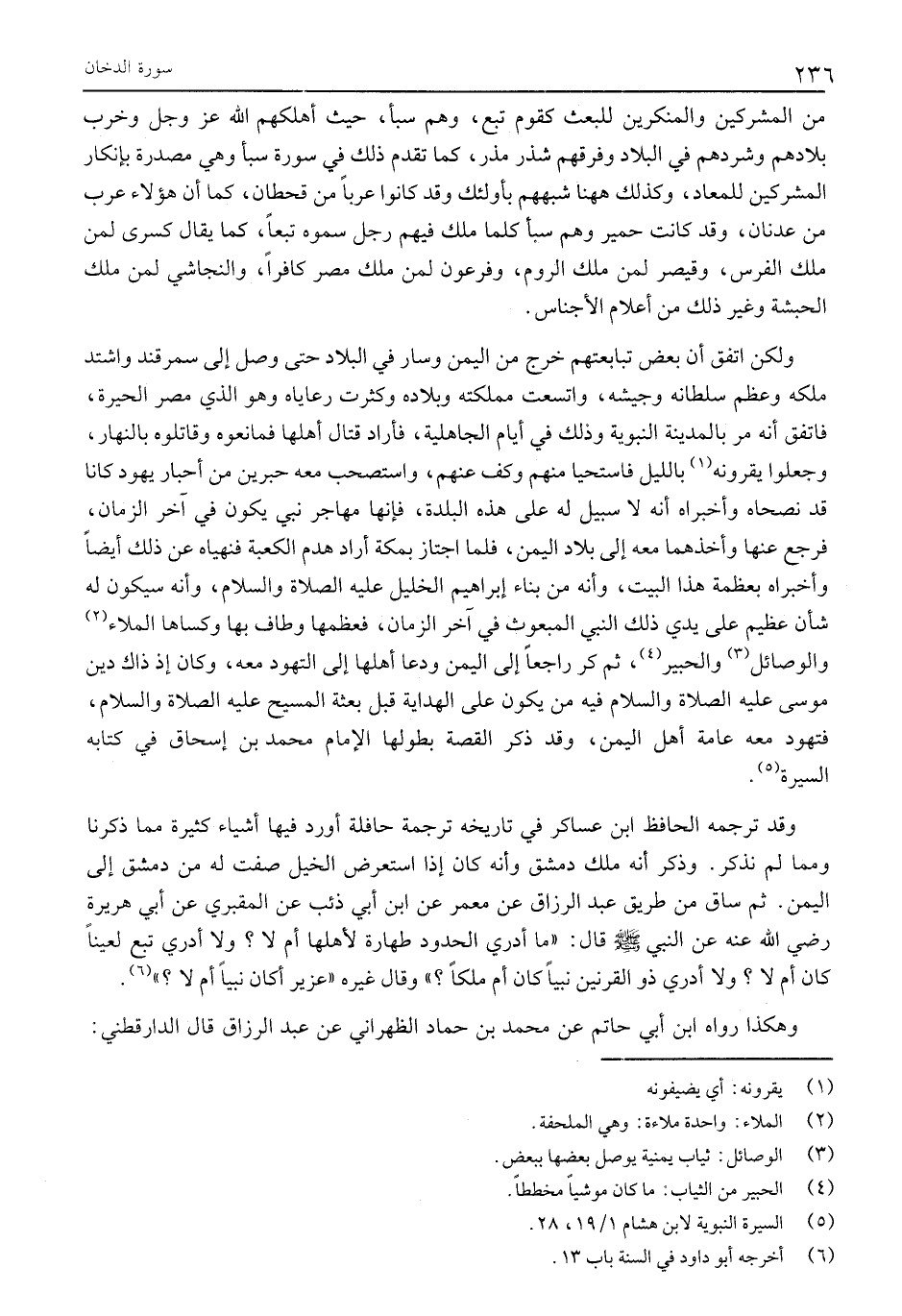 وَلَكِنِ اتَّفَقَ أَنَّ بَعْضَ تَبَابِعَتِهِمْ خَرَجَ مِنَ الْيَمَنِ وَسَارَ فِي الْبِلَادِ حَتَّى وَصَلَ إِلَى سَمَرْقَنْدَ وَاشْتَدَّ مُلْكُهُ وَعَظُمَ سُلْطَانُهُ وَجَيْشُهُ، وَاتَّسَعَتْ مَمْلَكَتُهُ وَبِلَادُهُ وَكَثُرَتْ رَعَايَاهُ وَهُوَ الَّذِي مَصَّرَ الْحِيرَةَ، فَاتَّفَقَ أَنَّهُ مَرَّ بِالْمَدِينَةِ النَّبَوِيَّةِ وَذَلِكَ فِي أَيَّامِ الْجَاهِلِيَّةِ، فَأَرَادَ قِتَالَ أَهْلِهَا فَمَانَعُوهُ وَقَاتَلُوهُ بِالنَّهَارِ، وَجَعَلُوا يَقْرُونَهُ «1» بِاللَّيْلِ فَاسْتَحْيَا مِنْهُمْ وَكَفَّ عَنْهُمْ، وَاسْتَصْحَبَ مَعَهُ حَبْرَيْنِ مِنْ أَحْبَارِ يَهُودَ كَانَا قَدْ نَصَحَاهُ وَأَخْبَرَاهُ أَنَّهُ لَا سَبِيلَ لَهُ عَلَى هَذِهِ الْبَلْدَةِ، فَإِنَّهَا مُهَاجَرُ نَبِيٍّ يَكُونُ فِي آخِرِ الزَّمَانِ، فَرَجَعَ عَنْهَا وَأَخَذَهُمَا مَعَهُ إِلَى بِلَادِ الْيَمَنِ، فَلَمَّا اجْتَازَ بِمَكَّةَ أَرَادَ هَدْمَ الْكَعْبَةِ فَنَهَيَاهُ عَنْ ذَلِكَ أَيْضًا وأخبراه بعظمة هذا البيت، وأنه من بناء إبراهيم الخليل عليه الصلاة والسلام، وَأَنَّهُ سَيَكُونُ لَهُ شَأْنٌ عَظِيمٌ عَلَى يَدَيْ ذَلِكَ النَّبِيِّ الْمَبْعُوثِ فِي آخِرِ الزَّمَانِ، فَعَظَّمَهَا وَطَافَ بِهَا وَكَسَاهَا الْمِلَاءَ «2» وَالْوَصَائِلَ «3» وَالْحَبِيرَ «4» ، ثُمَّ كَرَّ رَاجِعًا إِلَى الْيَمَنِ وَدَعَا أَهْلَهَا إِلَى التَّهَوُّدِ مَعَهُ، وَكَانَ إِذْ ذَاكَ دِينُ مُوسَى عليه الصلاة والسلام فِيهِ مَنْ يَكُونُ عَلَى الْهِدَايَةِ قَبْلَ بَعْثَةِ المسيح عليه الصلاة والسلام، فَتَهَوَّدَ مَعَهُ عَامَّةُ أَهْلِ الْيَمَنِ، وَقَدْ ذَكَرَ الْقِصَّةَ بِطُولِهَا الْإِمَامُ مُحَمَّدُ بْنُ إِسْحَاقَ فِي كِتَابِهِ السِّيرَةُ «5» .