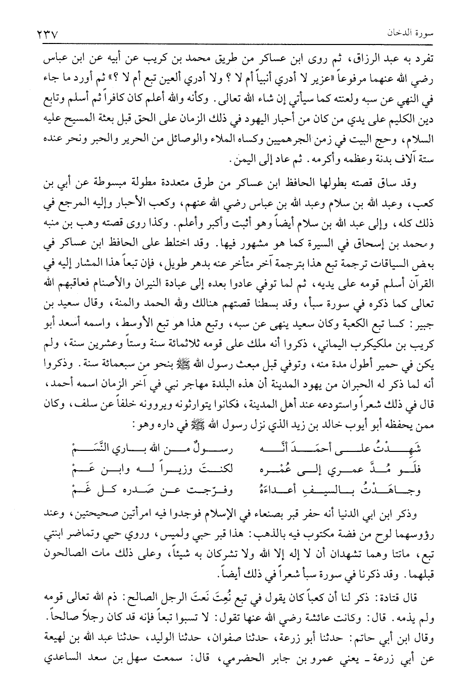 وَقَدْ سَاقَ قِصَّتَهُ بِطُولِهَا الْحَافِظُ ابْنُ عَسَاكِرَ مِنْ طُرُقٍ مُتَعَدِّدَةٍ مُطَوَّلَةٍ مَبْسُوطَةٍ عَنْ أُبَيِّ بْنِ كَعْبٍ، وَعَبْدِ اللَّهِ بْنِ سَلَامٍ وَعَبْدِ الله بن عباس رضي الله عنهم، وَكَعْبِ الْأَحْبَارِ وَإِلَيْهِ الْمَرْجِعُ فِي ذَلِكَ كُلِّهِ، وَإِلَى عَبْدِ اللَّهِ بْنِ سَلَامٍ أَيْضًا وَهُوَ أَثْبَتُ وَأَكْبُرُ وَأَعْلَمُ. وَكَذَا رَوَى قِصَّتَهُ وَهْبُ بْنُ مُنَبِّهٍ وَمُحَمَّدُ بْنُ إِسْحَاقَ فِي السِّيرَةِ كَمَا هُوَ مَشْهُورٌ فِيهَا. وَقَدِ اخْتَلَطَ عَلَى الْحَافِظِ ابْنِ عَسَاكِرَ فِي بَعْضِ السِّيَاقَاتِ تَرْجَمَةُ تُبَّعٍ هَذَا بِتَرْجَمَةِ آخَرَ مُتَأَخِّرٍ عَنْهُ بِدَهْرٍ طَوِيلٍ، فَإِنَّ تُبَّعًا هَذَا الْمُشَارَ إِلَيْهِ فِي الْقُرْآنِ أَسْلَمَ قَوْمُهُ عَلَى يَدَيْهِ، ثُمَّ لَمَّا توفي عادوا بعده إلى عبادة النيران والأصنام فَعَاقَبَهُمُ اللَّهُ تَعَالَى كَمَا ذَكَرَهُ فِي سُورَةِ سَبَأٍ، وَقَدْ بَسَطْنَا قِصَّتَهُمْ هُنَالِكَ وَلِلَّهِ الْحَمْدُ وَالْمِنَّةُ، وَقَالَ سَعِيدُ بْنُ جُبَيْرٍ: كَسَا تُبَّعٌ الْكَعْبَةَ وَكَانَ سَعِيدٌ يَنْهَى عَنْ سَبِّهِ، وَتُبَّعٌ هَذَا هُوَ تُبَّعٌ الْأَوْسَطُ، وَاسْمُهُ أَسْعَدُ أَبُو كُرَيْبِ بْنُ مَلْكِيَكْرِبَ الْيَمَانِيُّ، ذَكَرُوا أَنَّهُ مَلَكَ عَلَى قَوْمِهِ ثَلَاثَمِائَةِ سَنَةٍ وَسِتًّا وَعِشْرِينَ سَنَةً، وَلَمْ يَكُنْ فِي حِمْيَرَ أَطْوَلُ مُدَّةً مِنْهُ، وَتُوُفِّيَ قَبْلَ مَبْعَثِ رَسُولِ اللَّهِ صَلَّى اللَّهُ عَلَيْهِ وَسَلَّمَ بِنَحْوِ من سبعمائة سنة. وَذَكَرُوا أَنَّهُ لَمَّا ذَكَرَ لَهُ الْحَبْرَانِ مِنْ يَهُودِ الْمَدِينَةِ أَنَّ هَذِهِ الْبَلْدَةَ مُهَاجَرُ نَبِيٍّ في آخر الزَّمَانِ اسْمُهُ أَحْمَدُ، قَالَ فِي ذَلِكَ شِعْرًا واستودعه عند أهل المدينة، فكانوا يَتَوَارَثُونَهُ وَيَرْوُونَهُ خَلَفًا عَنْ سَلَفٍ، وَكَانَ مِمَّنْ يَحْفَظُهُ أَبُو أَيُّوبَ خَالِدُ بْنُ زَيْدٍ الَّذِي نَزَلَ رَسُولُ اللَّهِ صَلَّى اللَّهُ عَلَيْهِ وَسَلَّمَ فِي دَارِهِ وَهُوَ: