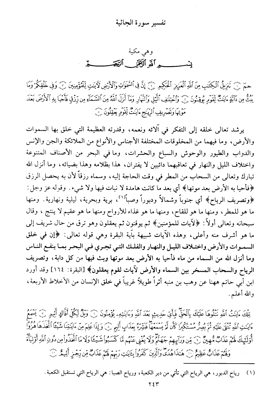 حم (1) تَنْزِيلُ الْكِتابِ مِنَ اللَّهِ الْعَزِيزِ الْحَكِيمِ (2) إِنَّ فِي السَّماواتِ وَالْأَرْضِ لَآياتٍ لِلْمُؤْمِنِينَ (3) وَفِي خَلْقِكُمْ وَما يَبُثُّ مِنْ دابَّةٍ آياتٌ لِقَوْمٍ يُوقِنُونَ (4)