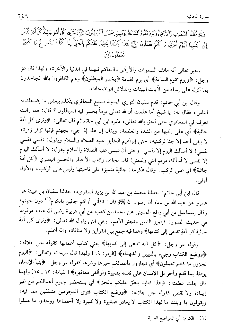 وَقَالَ ابْنُ أَبِي حَاتِمٍ: قَدِمَ سُفْيَانُ الثَّوْرِيُّ الْمَدِينَةَ فَسَمِعَ الْمُعَافِرِيَّ يَتَكَلَّمُ بِبَعْضِ مَا يَضْحَكُ بِهِ النَّاسُ، فَقَالَ لَهُ: يَا شَيْخُ أَمَّا علمت أن لله تعالى يَوْمًا يَخْسَرُ فِيهِ الْمُبْطِلُونَ؟ قَالَ: فَمَا زَالَتْ تعرف في المعافري حتى لحق بالله تعالى، ذكره ابن أبي حاتم ثم قال تعالى: وَتَرى كُلَّ أُمَّةٍ جاثِيَةً أَيْ عَلَى رُكَبِهَا من الشدة والعظمة، ويقال إن هذا إِذَا جِيءَ بِجَهَنَّمَ فَإِنَّهَا تَزْفِرُ زَفْرَةً، لَا يَبْقَى أَحَدٌ إِلَّا جَثَا لِرُكْبَتَيْهِ، حَتَّى إِبْرَاهِيمُ الخليل عليه الصلاة والسلام وَيَقُولُ: نَفْسِي نَفْسِي نَفْسِي! لَا أَسْأَلُكَ الْيَوْمَ إلا نفسي. وحتى أن عيسى عليه الصلاة والسلام لَيَقُولُ: لَا أَسْأَلُكَ الْيَوْمَ إِلَّا نَفْسِي لَا أسألك مَرْيَمَ الَّتِي وَلَدَتْنِي! قَالَ مُجَاهِدٌ وَكَعْبُ الْأَحْبَارِ وَالْحَسَنُ الْبَصْرِيُّ كُلَّ أُمَّةٍ جاثِيَةً أَيْ عَلَى الرُّكَبِ. وَقَالَ عِكْرِمَةُ: جَاثِيَةً مُتَمَيِّزَةً عَلَى نَاحِيَتِهَا وَلَيْسَ عَلَى الرُّكَبِ، وَالْأَوَّلُ أَوْلَى.