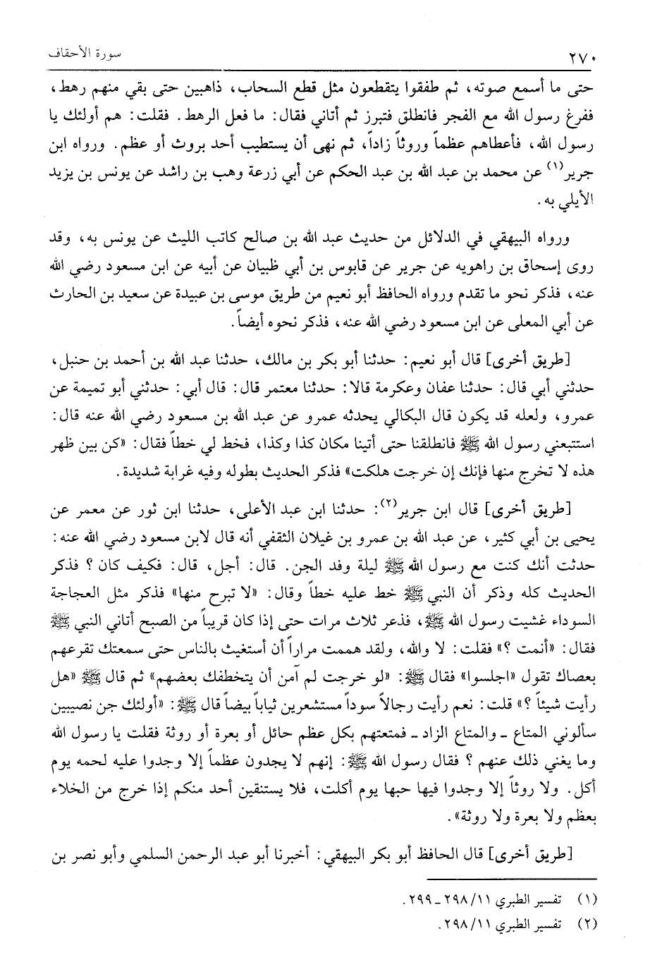 حَتَّى مَا أَسْمَعُ صَوْتَهُ، ثُمَّ طَفِقُوا يَتَقَطَّعُونَ مِثْلَ قِطَعِ السَّحَابِ، ذَاهِبِينَ حَتَّى بَقِيَ مِنْهُمْ رهط، ففرغ رسول الله مَعَ الْفَجْرِ فَانْطَلَقَ فَتَبَرَّزَ ثُمَّ أَتَانِي فَقَالَ: مَا فَعَلَ الرَّهْطُ. فَقُلْتُ: هُمْ أُولَئِكَ يَا رَسُولَ اللَّهِ، فَأَعْطَاهُمْ عَظْمًا وَرَوْثًا زَادًا، ثُمَّ نَهَى أَنْ يَسْتَطِيبَ أَحَدٌ بِرَوْثٍ أَوْ عَظْمٍ. وَرَوَاهُ ابْنُ جَرِيرٍ «1» عَنْ مُحَمَّدِ بْنِ عَبْدِ اللَّهِ بْنِ عَبْدِ الْحَكَمِ عَنْ أَبِي زُرْعَةَ وهب بْنِ رَاشِدٍ عَنْ يُونُسَ بْنِ يَزِيدَ الْأَيْلِيِّ بِهِ.