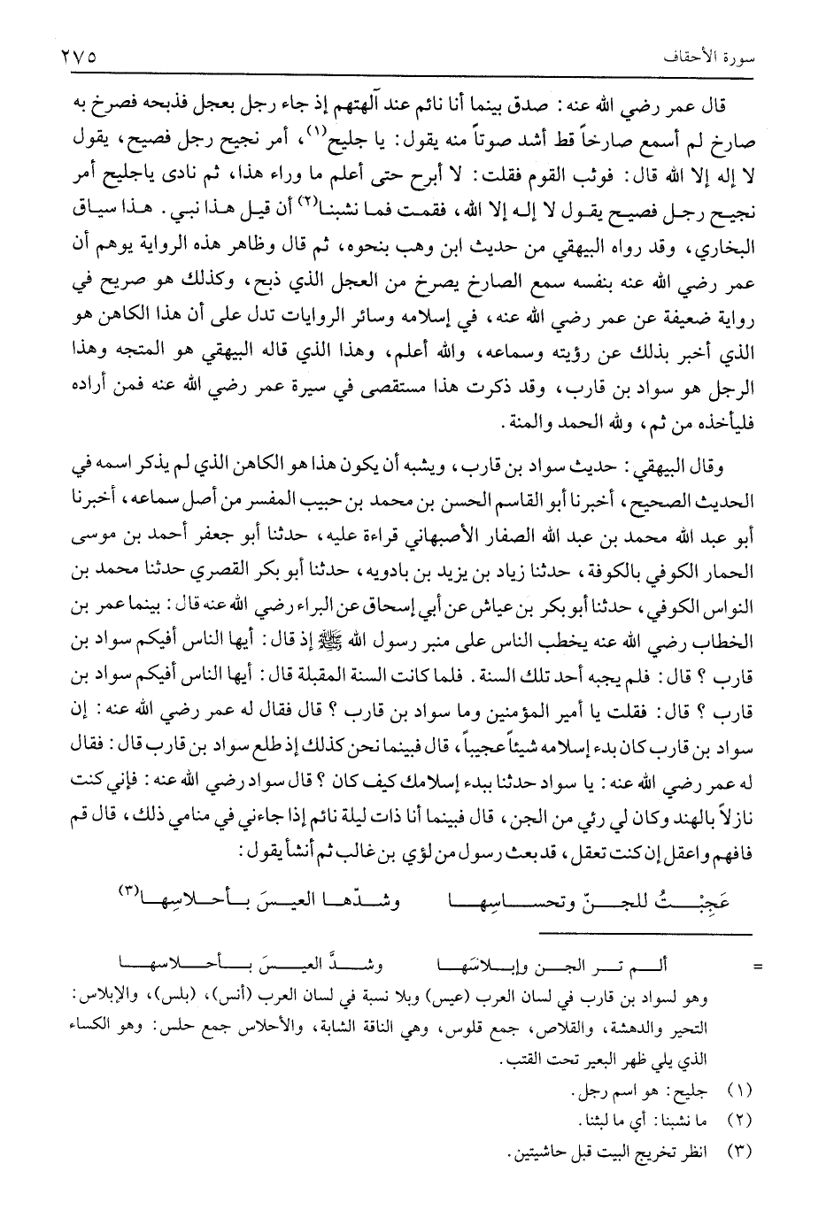 قال عمر رضي الله عنه: صَدَقَ بَيْنَمَا أَنَا نَائِمٌ عِنْدَ آلِهَتِهِمْ إِذْ جَاءَ رَجُلٌ بِعِجْلٍ فَذَبَحَهُ فَصَرَخَ بِهِ صَارِخٌ لَمْ أَسْمَعْ صَارِخًا قَطُّ أَشَدَّ صَوْتًا مِنْهُ يَقُولُ: يَا جَلِيحُ «1» ، أَمْرٌ نَجِيحٌ رَجُلٌ فَصِيحٌ، يقول لا إله إلا الله قال: فَوَثَبَ الْقَوْمُ فَقُلْتُ: لَا أَبْرَحُ حَتَّى أَعْلَمَ مَا وَرَاءَ هَذَا، ثُمَّ نَادَى يَا جَلِيحُ أَمْرٌ نَجِيحٌ رَجُلٌ فَصِيحٌ يَقُولُ لَا إِلَهَ إِلَّا اللَّهُ، فَقُمْتُ فَمَا نَشِبْنَا «2» أَنْ قِيلَ هَذَا نَبِيٌّ. هَذَا سِيَاقُ الْبُخَارِيِّ، وَقَدْ رَوَاهُ الْبَيْهَقِيُّ مِنْ حَدِيثِ ابْنِ وَهْبٍ بِنَحْوِهِ، ثُمَّ قَالَ وَظَاهِرُ هَذِهِ الرِّوَايَةِ يُوهِمُ أَنَّ عُمَرَ رضي الله عنه بِنَفْسِهِ سَمِعَ الصَّارِخَ يَصْرُخُ مِنَ الْعِجْلِ الَّذِي ذُبِحَ، وَكَذَلِكَ هُوَ صَرِيحٌ فِي رِوَايَةٍ ضَعِيفَةٍ عن عمر رضي الله عنه، فِي إِسْلَامِهِ وَسَائِرُ الرِّوَايَاتِ تَدُلُّ عَلَى أَنَّ هَذَا الْكَاهِنَ هُوَ الَّذِي أَخْبَرَ بِذَلِكَ عَنْ رُؤْيَتِهِ وَسَمَاعِهِ، وَاللَّهُ أَعْلَمُ، وَهَذَا الَّذِي قَالَهُ الْبَيْهَقِيُّ هُوَ الْمُتَّجَهُ وَهَذَا الرَّجُلُ هُوَ سَوَادُ بْنُ قَارِبٍ، وَقَدْ ذَكَرْتُ هَذَا مُسْتَقْصًى فِي سِيرَةِ عُمَرَ رَضِيَ اللَّهُ عَنْهُ فَمَنْ أَرَادَهُ فليأخذه من ثم، ولله الحمد والمنة.
