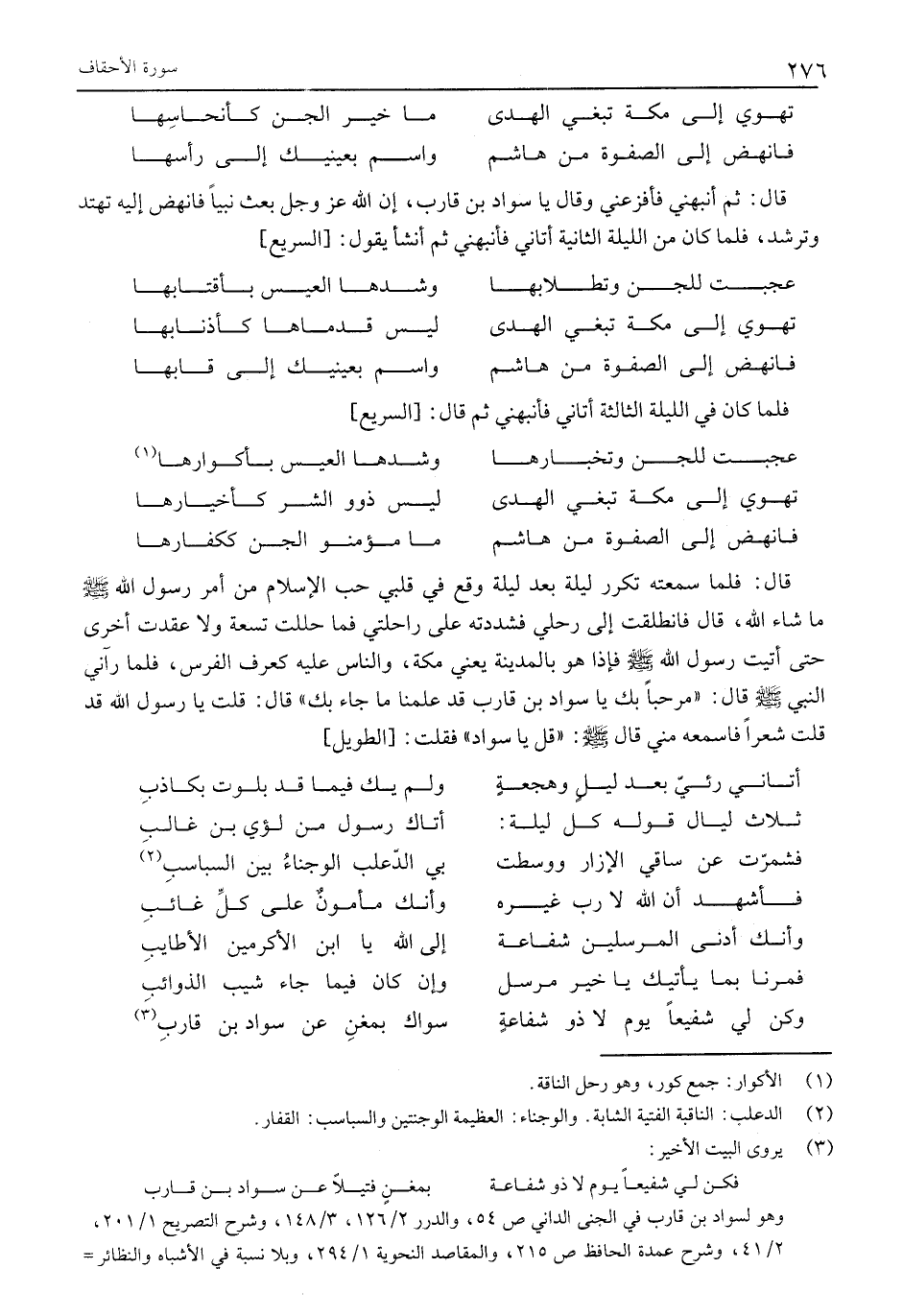 قَالَ: فَلَمَّا سَمِعْتُهُ تَكَرَّرَ لَيْلَةً بَعْدَ لَيْلَةٍ وَقَعَ فِي قَلْبِي حُبُّ الْإِسْلَامِ مِنْ أَمْرَ رَسُولِ اللَّهِ صَلَّى اللَّهُ عَلَيْهِ وَسَلَّمَ مَا شَاءَ اللَّهُ، قَالَ فَانْطَلَقْتُ إِلَى رَحْلِي فَشَدَدْتُهُ عَلَى رَاحِلَتِي فَمَا حَلَلْتُ تسعة وَلَا عَقَدْتُ أُخْرَى حَتَّى أَتَيْتُ رَسُولَ اللَّهِ صَلَّى اللَّهُ عَلَيْهِ وَسَلَّمَ فَإِذَا هُوَ بِالْمَدِينَةِ يَعْنِي مَكَّةَ، وَالنَّاسُ عَلَيْهِ كَعُرْفِ الْفَرَسِ، فَلَمَّا رَآنِي النَّبِيُّ صَلَّى اللَّهُ عَلَيْهِ وَسَلَّمَ قَالَ: «مَرْحَبًا بِكَ يَا سَوَادُ بْنَ قَارِبٍ قَدْ عَلِمْنَا مَا جَاءَ بِكَ» قَالَ: قُلْتُ يَا رَسُولَ اللَّهِ قَدْ قُلْتُ شِعْرًا فَاسْمَعْهُ مِنِّي قال صلى الله عليه وسلم: «قل يا سواد» فقلت: [الطويل]
