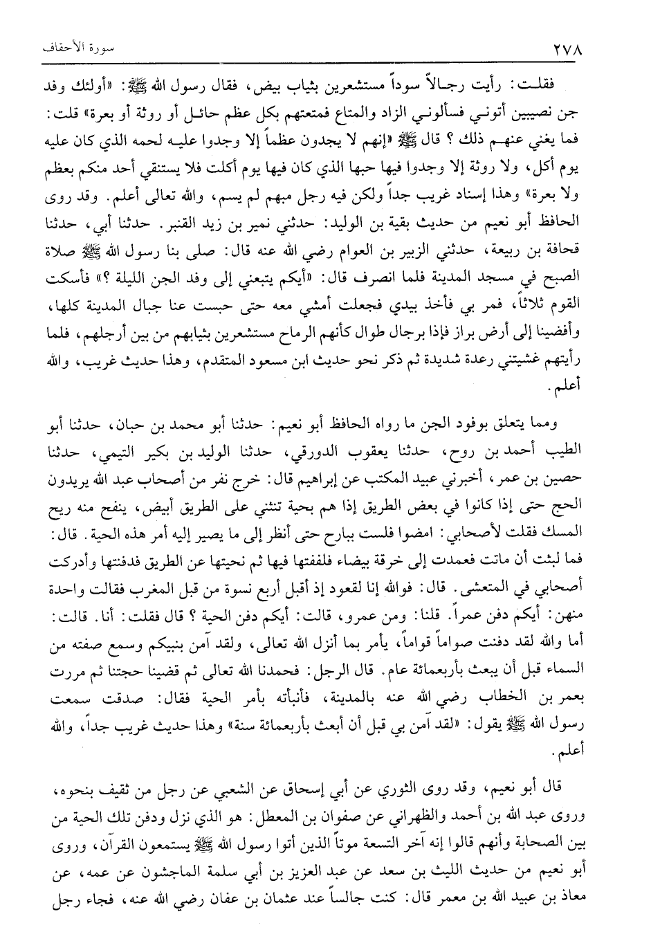 فما يغني عنهم ذلك؟ قال صلى الله عليه وسلم «إِنَّهُمْ لَا يَجِدُونَ عَظْمًا إِلَّا وَجَدُوا عَلَيْهِ لَحْمَهُ الَّذِي كَانَ عَلَيْهِ يَوْمَ أُكِلَ، وَلَا رَوْثَةً إِلَّا وَجَدُوا فِيهَا حَبَّهَا الَّذِي كَانَ فِيهَا يَوْمَ أُكِلَتْ فَلَا يَسْتَنْقِي أَحَدٌ مِنْكُمْ بِعَظْمٍ وَلَا بَعْرَةٍ» وَهَذَا إِسْنَادٌ غَرِيبٌ جِدًّا وَلَكِنْ فِيهِ رَجُلٌ مُبْهَمٌ لَمْ يُسَمَّ، وَاللَّهُ تعالى أَعْلَمُ. وَقَدْ رَوَى الْحَافِظُ أَبُو نُعَيْمٍ مِنْ حَدِيثِ بَقِيَّةَ بْنِ الْوَلِيدِ: حَدَّثَنِي نُمَيْرُ بْنُ زَيْدٍ الْقَنْبَرُ. حَدَّثَنَا أَبِي، حَدَّثَنَا قُحَافَةُ بْنُ ربيعة، حدثني الزبير بن العوام رضي الله عنه قَالَ: صَلَّى بِنَا رَسُولُ اللَّهِ صَلَّى اللَّهُ عَلَيْهِ وَسَلَّمَ صَلَاةَ الصُّبْحِ فِي مَسْجِدِ الْمَدِينَةِ فَلَمَّا انْصَرَفَ قَالَ: «أَيُّكُمْ يَتْبَعُنِي إِلَى وَفْدِ الْجِنِّ اللَّيْلَةَ؟» فَأَسْكَتَ الْقَوْمُ ثَلَاثًا، فَمَرَّ بِي فَأَخَذَ بِيَدِي فَجَعَلْتُ أَمْشِي مَعَهُ حَتَّى حُبِسَتْ عَنَّا جِبَالُ الْمَدِينَةِ كُلُّهَا، وَأَفْضَيْنَا إِلَى أَرْضِ بَرَازٍ فَإِذَا بِرِجَالٍ طُوَالٍ كَأَنَّهُمُ الرِّمَاحُ مُسْتَشْعِرِينَ بِثِيَابِهِمْ مِنْ بَيْنِ أَرْجُلِهِمْ، فَلَمَّا رَأَيْتُهُمْ غَشِيَتْنِي رِعْدَةٌ شَدِيدَةٌ ثُمَّ ذَكَرَ نَحْوَ حَدِيثِ ابْنِ مَسْعُودٍ الْمُتَقَدِّمِ، وَهَذَا حَدِيثٌ غَرِيبٌ، وَاللَّهُ أَعْلَمُ.