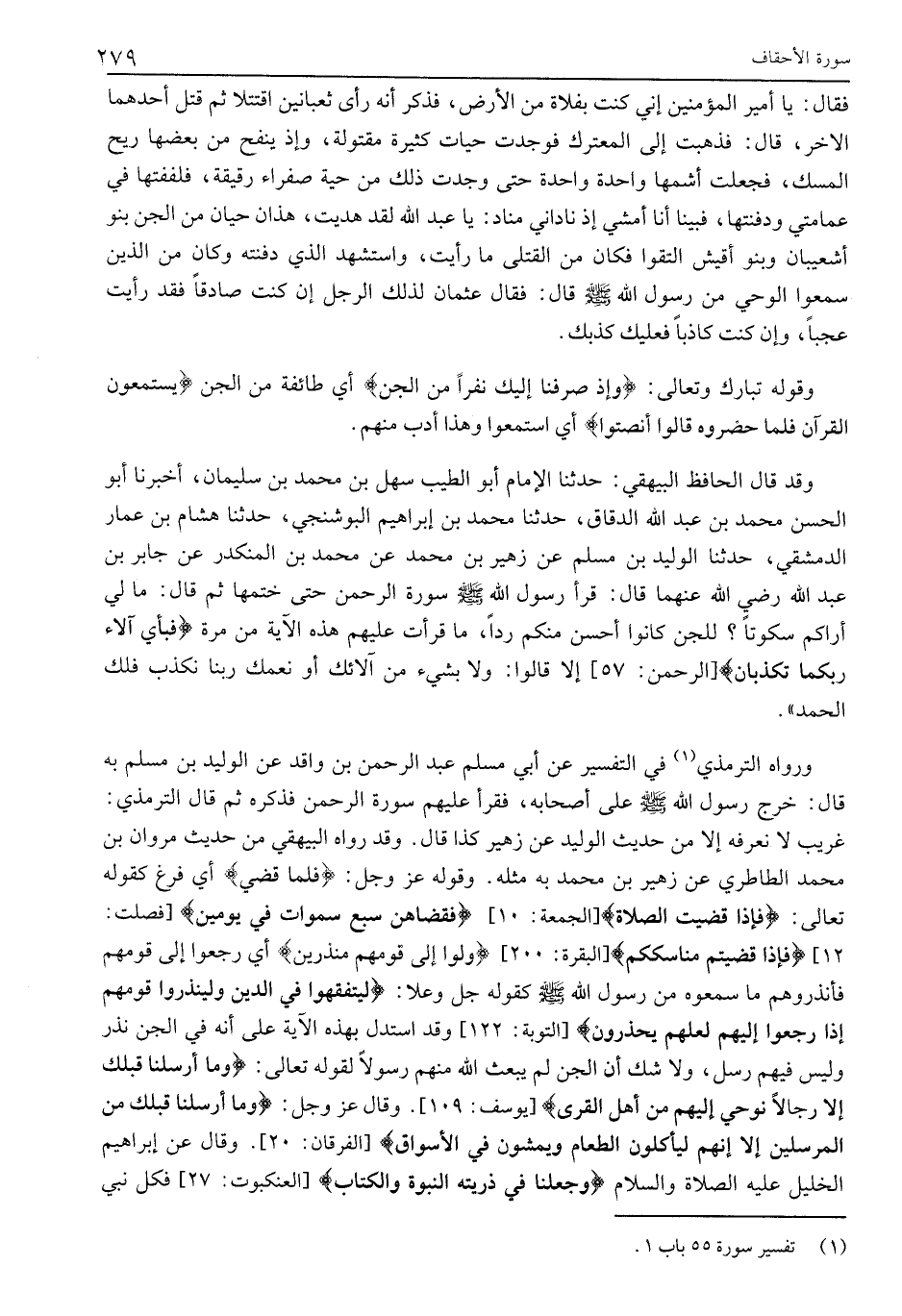 فَقَالَ: يَا أَمِيرَ الْمُؤْمِنِينَ إِنِّي كُنْتُ بِفَلَاةٍ مِنَ الْأَرْضِ، فَذَكَرَ أَنَّهُ رَأَى ثُعْبَانَيْنِ اقْتَتَلَا ثُمَّ قَتَلَ أَحَدُهُمَا الْآخَرَ، قَالَ: فَذَهَبْتُ إِلَى الْمُعْتَرَكِ فَوَجَدْتُ حَيَّاتٍ كَثِيرَةً مَقْتُولَةً، وَإِذْ يَنْفَحُ مِنْ بَعْضِهَا رِيحُ الْمِسْكِ، فَجَعَلْتُ أَشُمُّهَا وَاحِدَةً وَاحِدَةً حَتَّى وَجَدْتُ ذَلِكَ مِنْ حَيَّةٍ صَفْرَاءَ رَقِيقَةٍ، فَلَفَفْتُهَا فِي عِمَامَتِي وَدَفَنْتُهَا، فَبَيْنَا أَنَا أَمْشِي إِذْ نَادَانِي مُنَادٍ: يَا عَبْدَ اللَّهِ لَقَدْ هُدِيتَ، هَذَانَ حَيَّانِ مِنَ الْجِنِّ بَنُو أَشْعِيبَانَ وَبَنُو أُقَيْشٍ الْتَقَوْا فَكَانَ مِنَ الْقَتْلَى مَا رَأَيْتَ، وَاسْتُشْهِدَ الَّذِي دَفَنْتَهُ وَكَانَ مِنَ الَّذِينَ سَمِعُوا الْوَحْيَ مِنْ رَسُولِ اللَّهِ صَلَّى اللَّهُ عَلَيْهِ وَسَلَّمَ قَالَ: فَقَالَ عُثْمَانُ لِذَلِكَ الرَّجُلِ إِنْ كُنْتَ صَادِقًا فَقَدْ رَأَيْتَ عَجَبًا، وإن كنت كاذبا فعليك كذبك.