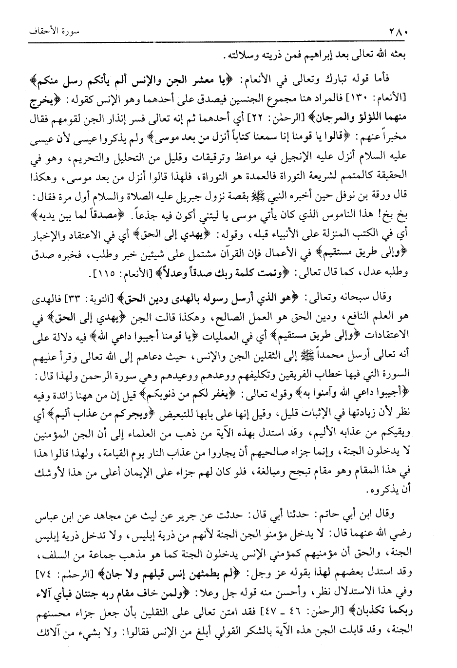 وقال سبحانه وتعالى: هُوَ الَّذِي أَرْسَلَ رَسُولَهُ بِالْهُدى وَدِينِ الْحَقِّ [التَّوْبَةِ: 33] فَالْهُدَى هُوَ الْعِلْمُ النَّافِعُ، وَدِينُ الْحَقِّ هُوَ الْعَمَلُ الصَّالِحُ، وَهَكَذَا قَالَتِ الْجِنُّ يَهْدِي إِلَى الْحَقِّ فِي الِاعْتِقَادَاتِ وَإِلى طَرِيقٍ مُسْتَقِيمٍ أَيْ فِي الْعَمَلِيَّاتِ يَا قَوْمَنا أَجِيبُوا داعِيَ اللَّهِ فِيهِ دَلَالَةٌ عَلَى أَنَّهُ تَعَالَى أَرْسَلَ محمدا صلى الله عليه وسلم إلى الثقلين الجن والإنس، حيث دعاهم إلى الله تعالى وَقَرَأَ عَلَيْهِمُ السُّورَةَ الَّتِي فِيهَا خِطَابُ الْفَرِيقَيْنِ وَتَكْلِيفُهُمْ وَوَعْدُهُمْ وَوَعِيدُهُمْ وَهِيَ سُورَةُ الرَّحْمَنِ وَلِهَذَا قَالَ: