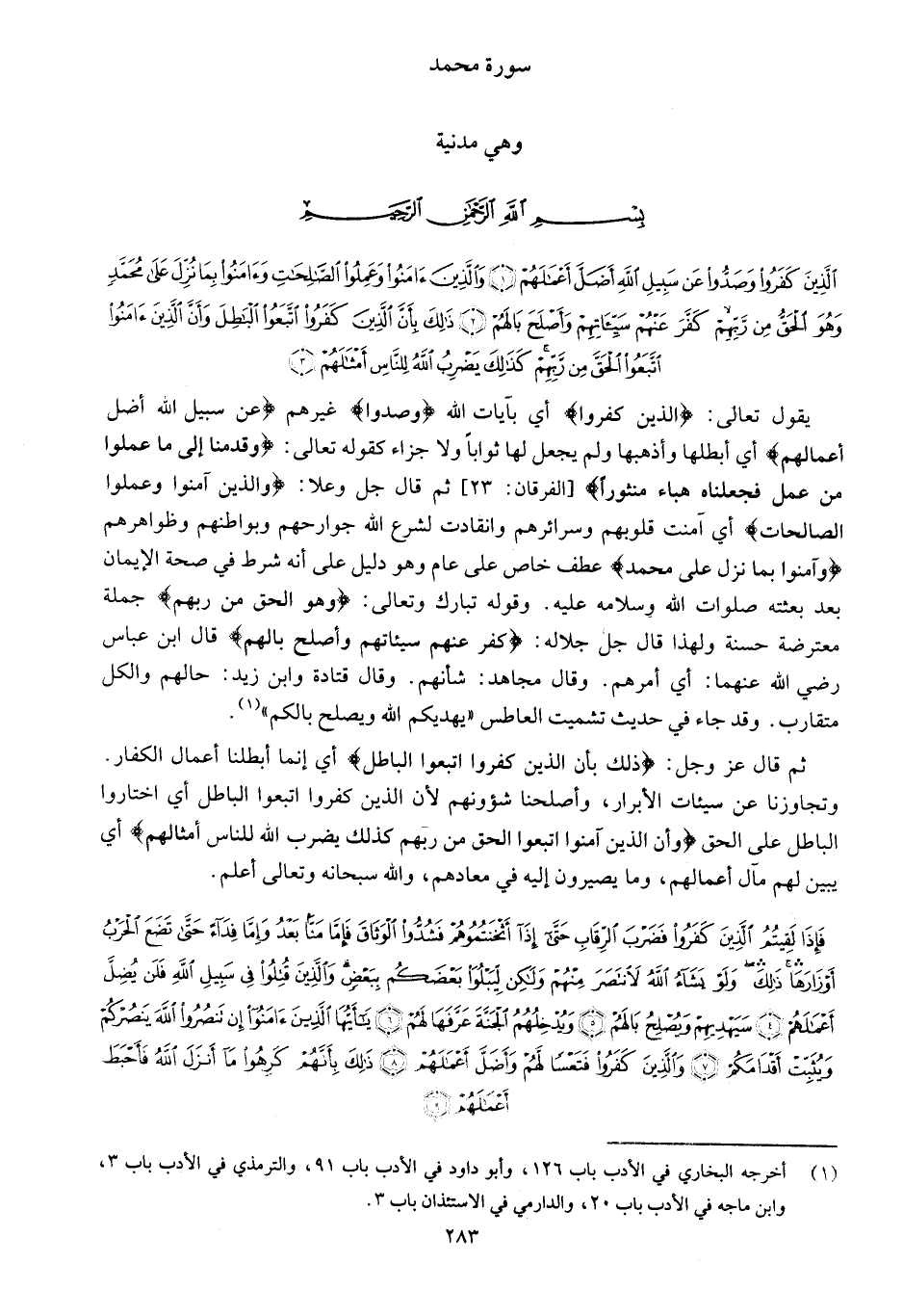 الَّذِينَ كَفَرُوا وَصَدُّوا عَنْ سَبِيلِ اللَّهِ أَضَلَّ أَعْمالَهُمْ (1) وَالَّذِينَ آمَنُوا وَعَمِلُوا الصَّالِحاتِ وَآمَنُوا بِما نُزِّلَ عَلى مُحَمَّدٍ وَهُوَ الْحَقُّ مِنْ رَبِّهِمْ كَفَّرَ عَنْهُمْ سَيِّئاتِهِمْ وَأَصْلَحَ بالَهُمْ (2) ذلِكَ بِأَنَّ الَّذِينَ كَفَرُوا اتَّبَعُوا الْباطِلَ وَأَنَّ الَّذِينَ آمَنُوا اتَّبَعُوا الْحَقَّ مِنْ رَبِّهِمْ كَذلِكَ يَضْرِبُ اللَّهُ لِلنَّاسِ أَمْثالَهُمْ (3)