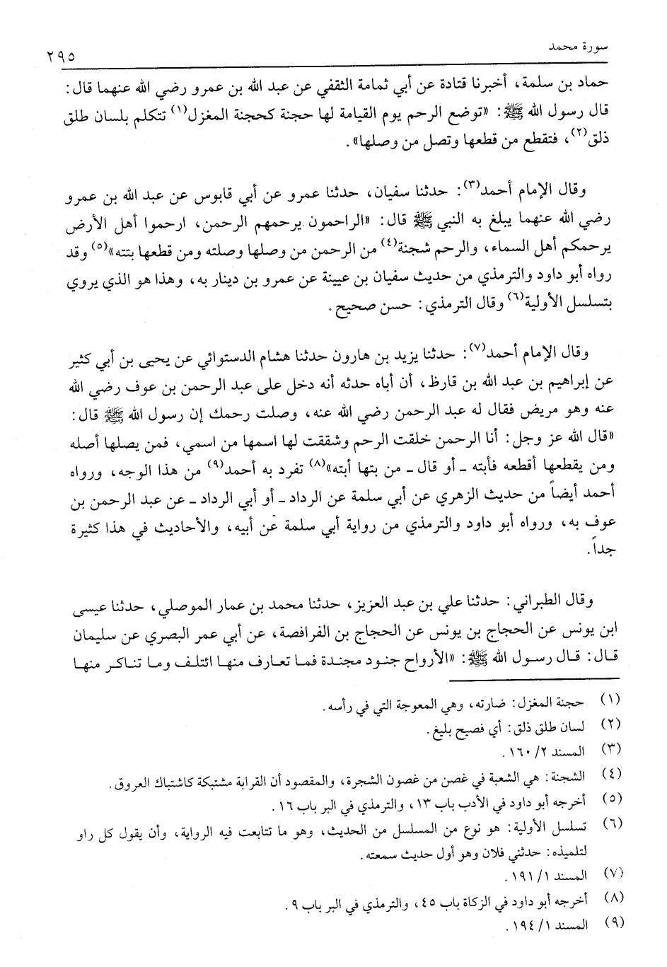 «قَالَ اللَّهُ عَزَّ وَجَلَّ: أَنَا الرَّحْمَنُ خلقت الرحم وشققت لها اسمها مِنَ اسْمِي، فَمَنْ يَصِلْهَا أَصِلْهُ وَمَنْ يَقْطَعْهَا أقطعه فأبته- أو قال- من بتها أبته» «8» تَفَرَّدَ بِهِ أَحْمَدُ «9» مِنْ هَذَا الْوَجْهِ، وَرَوَاهُ أَحْمَدُ أَيْضًا مِنْ حَدِيثِ الزُّهْرِيِّ عَنْ أَبِي سَلَمَةَ عَنْ الرَّدَّادِ- أَوْ أَبِي الرَّدَّادِ- عَنْ عَبْدِ الرَّحْمَنِ بْنِ عَوْفٍ بِهِ، وَرَوَاهُ أَبُو دَاوُدَ وَالتِّرْمِذِيُّ مِنْ رِوَايَةِ أَبِي سَلَمَةَ عَنْ أَبِيهِ، وَالْأَحَادِيثُ فِي هذا كثيرة جدا.