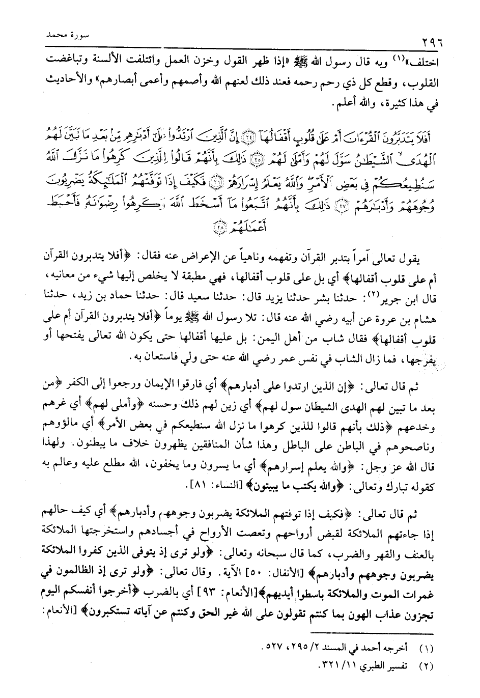أَفَلا يَتَدَبَّرُونَ الْقُرْآنَ أَمْ عَلى قُلُوبٍ أَقْفالُها (24) إِنَّ الَّذِينَ ارْتَدُّوا عَلى أَدْبارِهِمْ مِنْ بَعْدِ مَا تَبَيَّنَ لَهُمُ الْهُدَى الشَّيْطانُ سَوَّلَ لَهُمْ وَأَمْلى لَهُمْ (25) ذلِكَ بِأَنَّهُمْ قالُوا لِلَّذِينَ كَرِهُوا مَا نَزَّلَ اللَّهُ سَنُطِيعُكُمْ فِي بَعْضِ الْأَمْرِ وَاللَّهُ يَعْلَمُ إِسْرارَهُمْ (26) فَكَيْفَ إِذا تَوَفَّتْهُمُ الْمَلائِكَةُ يَضْرِبُونَ وُجُوهَهُمْ وَأَدْبارَهُمْ (27) ذلِكَ بِأَنَّهُمُ اتَّبَعُوا مَا أَسْخَطَ اللَّهَ وَكَرِهُوا رِضْوانَهُ فَأَحْبَطَ أَعْمالَهُمْ (28)