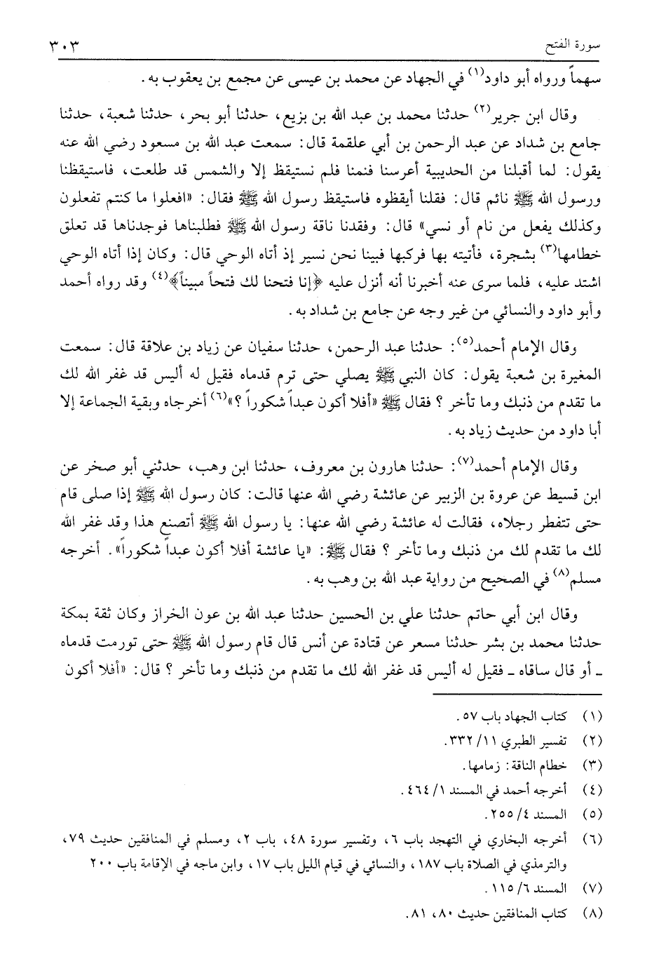 وَقَالَ الْإِمَامُ أَحْمَدُ «5» : حَدَّثَنَا عَبْدُ الرَّحْمَنِ، حَدَّثَنَا سُفْيَانُ عَنْ زِيَادِ بْنِ عَلَاقَةَ قَالَ: سَمِعْتُ الْمُغِيرَةَ بْنَ شُعْبَةَ يَقُولُ: كَانَ النَّبِيُّ صَلَّى اللَّهُ عَلَيْهِ وَسَلَّمَ يُصَلِّي حَتَّى تَرِمَ قَدَمَاهُ فَقِيلَ لَهُ أَلَيْسَ قَدْ غَفَرَ اللَّهُ لَكَ مَا تَقَدَّمَ مِنْ ذَنْبِكَ وما تأخر؟ فقال صلى الله عليه وسلم «أَفَلَا أَكُونُ عَبْدًا شَكُورًا؟» «6» أَخْرَجَاهُ وَبَقِيَّةُ الْجَمَاعَةِ إِلَّا أَبَا دَاوُدَ مِنْ حَدِيثِ زِيَادٍ بِهِ.