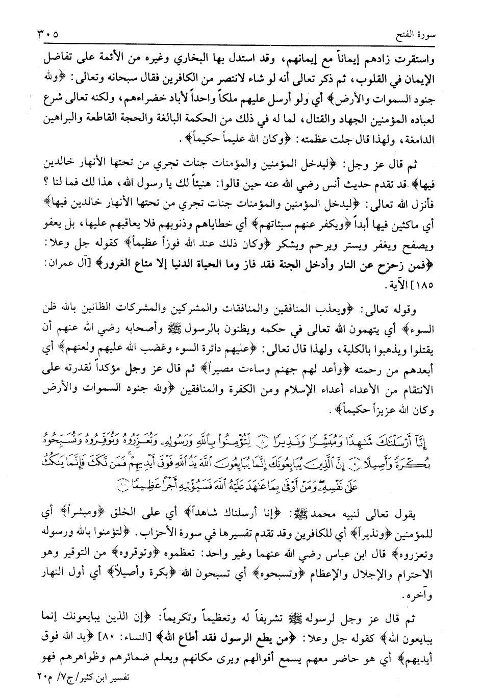 إِنَّا أَرْسَلْناكَ شاهِداً وَمُبَشِّراً وَنَذِيراً (8) لِتُؤْمِنُوا بِاللَّهِ وَرَسُولِهِ وَتُعَزِّرُوهُ وَتُوَقِّرُوهُ وَتُسَبِّحُوهُ بُكْرَةً وَأَصِيلاً (9) إِنَّ الَّذِينَ يُبايِعُونَكَ إِنَّما يُبايِعُونَ اللَّهَ يَدُ اللَّهِ فَوْقَ أَيْدِيهِمْ فَمَنْ نَكَثَ فَإِنَّما يَنْكُثُ عَلى نَفْسِهِ وَمَنْ أَوْفى بِما عاهَدَ عَلَيْهُ اللَّهَ فَسَيُؤْتِيهِ أَجْراً عَظِيماً (10)