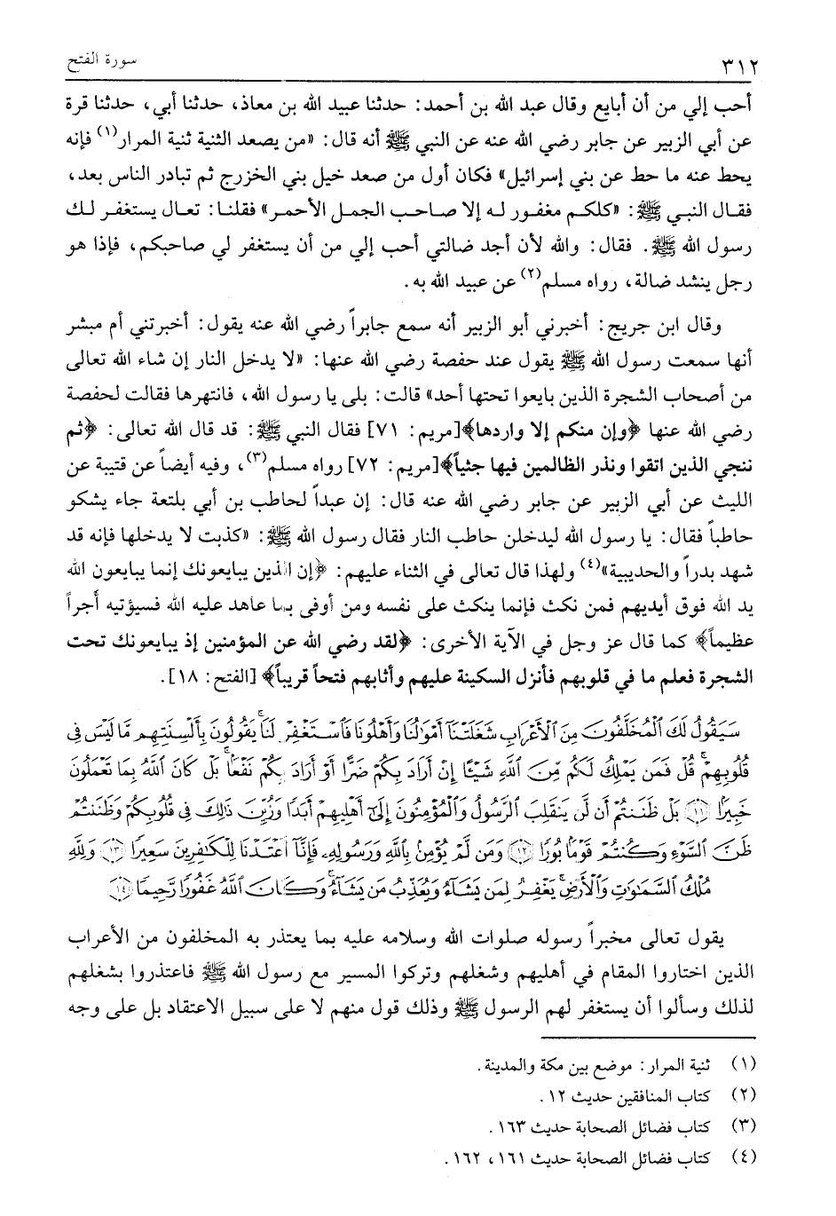 وَقَالَ ابْنُ جُرَيْجٍ: أَخْبَرَنِي أَبُو الزُّبَيْرِ أَنَّهُ سَمِعَ جابرا رضي الله عنه يَقُولُ: أَخْبَرَتْنِي أُمُّ مُبَشِّرٍ أَنَّهَا سَمِعَتْ رَسُولَ اللَّهِ صَلَّى اللَّهُ عَلَيْهِ وَسَلَّمَ يَقُولُ عِنْدَ حفصة رضي الله عنها: «لا يدخل النار إن شاء الله تعالى مِنْ أَصْحَابِ الشَّجَرَةِ الَّذِينَ بَايَعُوا تَحْتَهَا أَحَدٌ» قَالَتْ: بَلَى يَا رَسُولَ اللَّهِ، فَانْتَهَرَهَا فَقَالَتْ لحفصة رضي الله عنها وَإِنْ مِنْكُمْ إِلَّا وارِدُها [مَرْيَمَ: 71] فَقَالَ النَّبِيُّ صَلَّى اللَّهُ عَلَيْهِ وَسَلَّمَ: قَدْ قَالَ اللَّهُ تَعَالَى: ثُمَّ نُنَجِّي الَّذِينَ اتَّقَوْا وَنَذَرُ الظَّالِمِينَ فِيها جِثِيًّا [مَرْيَمَ: 72] رَوَاهُ مُسْلِمٌ «3» ، وَفِيهِ أَيْضًا عَنْ قُتَيْبَةَ عَنِ اللَّيْثِ عَنْ أَبِي الزُّبَيْرِ عَنْ جَابِرٍ رَضِيَ اللَّهُ عنه قال: أَنَّ عَبْدًا لِحَاطِبِ بْنِ أَبِي بَلْتَعَةَ جَاءَ يَشْكُو حَاطِبًا فَقَالَ: يَا رَسُولَ اللَّهِ لَيَدْخُلَنَّ حَاطِبٌ النَّارَ فَقَالَ رَسُولُ اللَّهِ صَلَّى اللَّهُ عَلَيْهِ وَسَلَّمَ: «كَذَبْتَ لَا يَدْخُلُهَا فَإِنَّهُ قَدْ شَهِدَ بَدْرًا وَالْحُدَيْبِيَةَ» «4» وَلِهَذَا قَالَ تَعَالَى فِي الثَّنَاءِ عَلَيْهِمْ: إِنَّ الَّذِينَ يُبايِعُونَكَ إِنَّما يُبايِعُونَ اللَّهَ يَدُ اللَّهِ فَوْقَ أَيْدِيهِمْ فَمَنْ نَكَثَ فَإِنَّما يَنْكُثُ عَلى نَفْسِهِ وَمَنْ أَوْفى بِما عاهَدَ عَلَيْهُ اللَّهَ فَسَيُؤْتِيهِ أَجْراً عَظِيماً كما قال عز وجل فِي الْآيَةِ الْأُخْرَى: لَقَدْ رَضِيَ اللَّهُ عَنِ الْمُؤْمِنِينَ إِذْ يُبايِعُونَكَ تَحْتَ الشَّجَرَةِ فَعَلِمَ مَا فِي قُلُوبِهِمْ فَأَنْزَلَ السَّكِينَةَ عَلَيْهِمْ وَأَثابَهُمْ فَتْحاً قَرِيباً [الفتح: 18] .