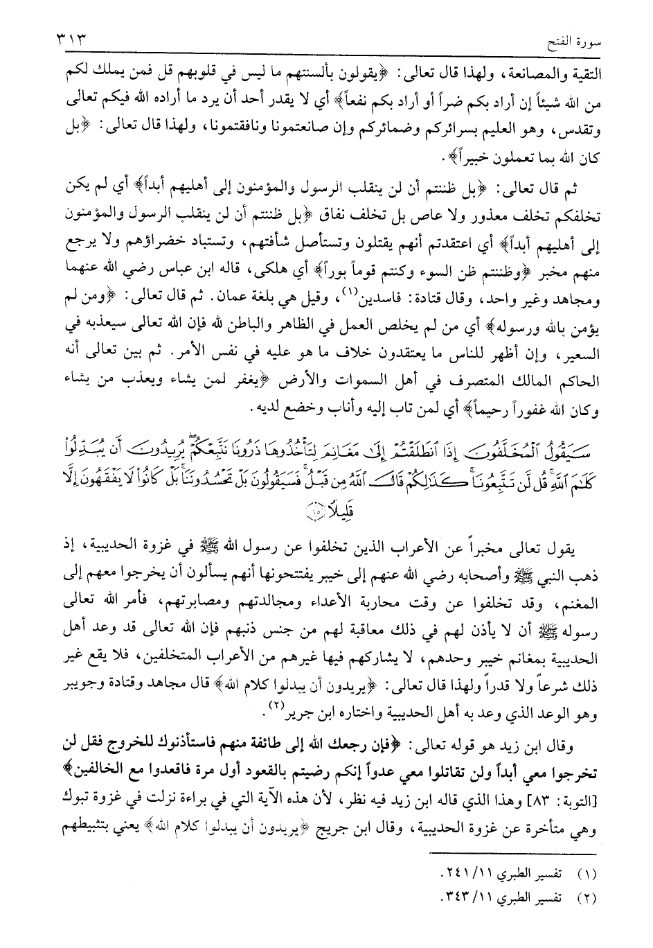 وَقَالَ ابْنُ زيد هو قوله تعالى: فَإِنْ رَجَعَكَ اللَّهُ إِلى طائِفَةٍ مِنْهُمْ فَاسْتَأْذَنُوكَ لِلْخُرُوجِ فَقُلْ لَنْ تَخْرُجُوا مَعِيَ أَبَداً وَلَنْ تُقاتِلُوا مَعِيَ عَدُوًّا إِنَّكُمْ رَضِيتُمْ بِالْقُعُودِ أَوَّلَ مَرَّةٍ فَاقْعُدُوا مَعَ الْخالِفِينَ [التَّوْبَةِ: 83] وَهَذَا الَّذِي قَالَهُ ابْنُ زَيْدٍ فِيهِ نَظَرٌ، لِأَنَّ هَذِهِ الْآيَةَ الَّتِي فِي بَرَاءَةَ نَزَلَتْ فِي غَزْوَةِ تَبُوكَ وَهِيَ مُتَأَخِّرَةٌ عَنْ غَزْوَةِ الْحُدَيْبِيَةِ، وَقَالَ ابْنُ جُرَيْجٍ يُرِيدُونَ أَنْ يُبَدِّلُوا كَلامَ اللَّهِ يعني بتثبيطهم
