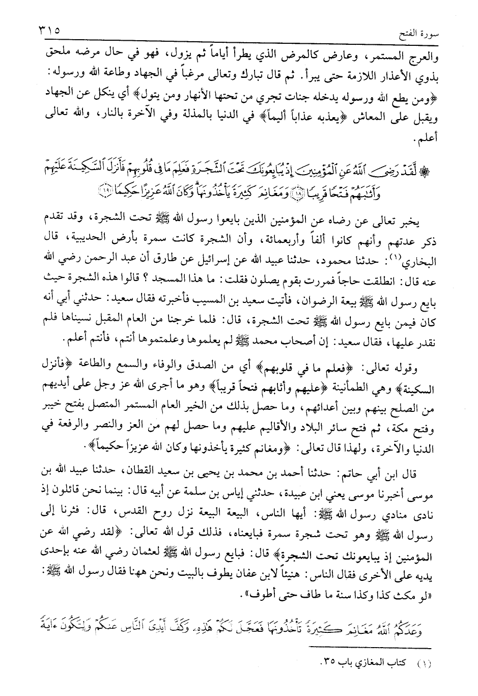 لَقَدْ رَضِيَ اللَّهُ عَنِ الْمُؤْمِنِينَ إِذْ يُبايِعُونَكَ تَحْتَ الشَّجَرَةِ فَعَلِمَ مَا فِي قُلُوبِهِمْ فَأَنْزَلَ السَّكِينَةَ عَلَيْهِمْ وَأَثابَهُمْ فَتْحاً قَرِيباً (18) وَمَغانِمَ كَثِيرَةً يَأْخُذُونَها وَكانَ اللَّهُ عَزِيزاً حَكِيماً (19)
