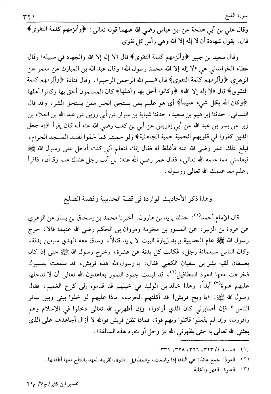 وَقَالَ سَعِيدُ بْنُ جُبَيْرٍ وَأَلْزَمَهُمْ كَلِمَةَ التَّقْوى قَالَ «لَا إِلَهَ إِلَّا اللَّهُ وَالْجِهَادُ فِي سَبِيلِهِ» وَقَالَ عَطَاءٌ الْخُرَاسَانِيُّ هِيَ «لَا إِلَهَ إِلَّا اللَّهُ مُحَمَّدٌ رَسُولُ اللَّهِ» وَقَالَ عَبْدُ اللَّهِ بْنُ الْمُبَارَكِ عَنْ مَعْمَرٍ عن الزُّهْرِيِّ وَأَلْزَمَهُمْ كَلِمَةَ التَّقْوى قَالَ «بِسْمِ اللَّهِ الرَّحْمَنِ الرَّحِيمِ» . وَقَالَ قَتَادَةُ وَأَلْزَمَهُمْ كَلِمَةَ التَّقْوى قَالَ «لَا إِلَهَ إِلَّا اللَّهُ» وَكانُوا أَحَقَّ بِها وَأَهْلَها كَانَ الْمُسْلِمُونَ أَحَقَّ بِهَا وَكَانُوا أَهْلَهَا وَكانَ اللَّهُ بِكُلِّ شَيْءٍ عَلِيماً أَيْ هُوَ عَلِيمٌ بِمَنْ يستحق الخير ممن يَسْتَحِقُّ الشَّرَّ، وَقَدْ قَالَ النَّسَائِيُّ: حَدَّثَنَا إِبْرَاهِيمُ بْنُ سَعِيدٍ، حَدَّثَنَا شَبَابَةُ بْنُ سَوَّارٍ عَنْ أَبِي رَزِينٍ عَنْ عَبْدِ اللَّهِ بْنِ الْعَلَاءِ بن زبر عن بسر بن عبد اللَّهِ عَنْ أَبِي إِدْرِيسَ عَنْ أُبَيِّ بْنِ كَعْبٍ رَضِيَ اللَّهُ عَنْهُ أَنَّهُ كَانَ يَقْرَأُ إِذْ جَعَلَ الَّذِينَ كَفَرُوا فِي قُلُوبِهِمُ الْحَمِيَّةَ حَمِيَّةَ الْجاهِلِيَّةِ وَلَوْ حَمَيْتُمْ كَمَا حَمُوا لَفَسَدَ الْمَسْجِدُ الْحَرَامُ، فبلغ ذلك عمر رضي الله عنه فَأَغْلَظَ لَهُ فَقَالَ إِنَّكَ لَتَعْلَمُ أَنِّي كُنْتُ أَدْخُلُ عَلَى رَسُولِ اللَّهِ صَلَّى اللَّهُ عَلَيْهِ وسلم فيعلمني مما علمه الله تعالى، فقال عمر رضي الله عنه: بَلْ أَنْتَ رَجُلٌ عِنْدَكَ عِلْمٌ وَقُرْآنٌ، فَاقْرَأْ وعلم مما علمك الله تعالى وَرَسُولُهُ.