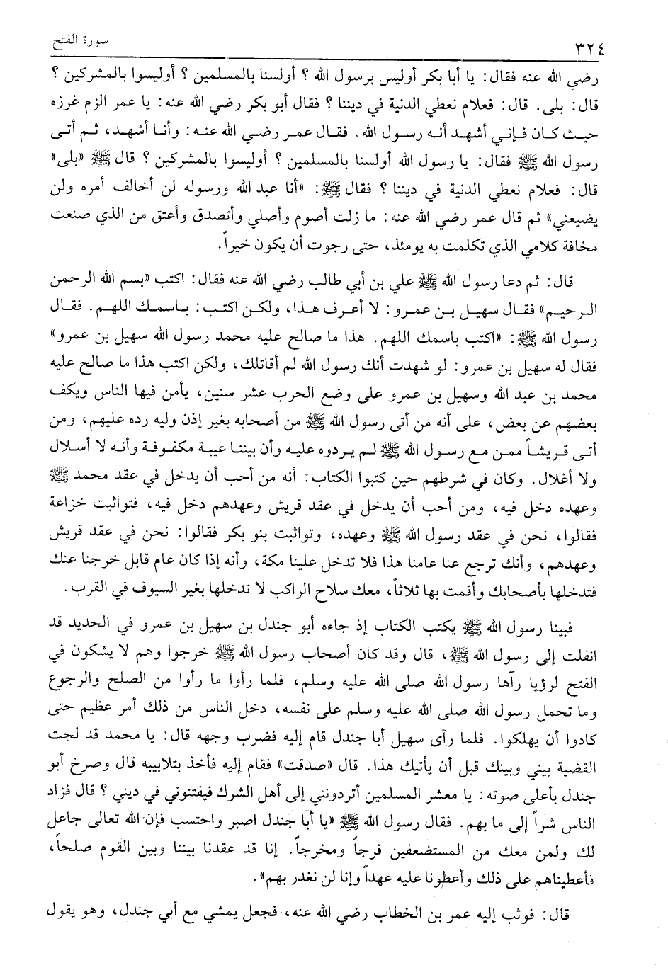 قَالَ: ثُمَّ دَعَا رَسُولُ اللَّهِ صَلَّى اللَّهُ عَلَيْهِ وَسَلَّمَ عَلِيَّ بْنَ أَبِي طَالِبٍ رَضِيَ اللَّهُ عَنْهُ فَقَالَ: اكْتُبْ «بِسْمِ اللَّهِ الرَّحْمَنِ الرَّحِيمِ» فقال سهيل بن عمرو: لا أَعْرِفُ هَذَا، وَلَكِنِ اكْتُبْ: بِاسْمِكَ اللَّهُمَّ. فَقَالَ رَسُولُ اللَّهِ صَلَّى اللَّهُ عَلَيْهِ وَسَلَّمَ: «اكْتُبْ بِاسْمِكِ اللَّهُمَّ. هَذَا مَا صَالَحَ عَلَيْهِ مُحَمَّدٌ رَسُولُ اللَّهِ سهيل بن عمرو» فقال له سهيل بن عمرو: لو شَهِدْتُ أَنَّكَ رَسُولُ اللَّهِ لَمْ أُقَاتِلْكَ، وَلَكِنِ اكْتُبْ هَذَا مَا صَالَحَ عَلَيْهِ مُحَمَّدُ بْنُ عبد الله وسهيل بْنُ عَمْرٍو عَلَى وَضْعِ الْحَرْبِ عَشْرَ سِنِينَ، يَأْمَنُ فِيهَا النَّاسُ وَيَكُفُّ بَعْضُهُمْ عَنْ بَعْضٍ، على أنه من أَتَى رَسُولَ اللَّهِ صَلَّى اللَّهُ عَلَيْهِ وَسَلَّمَ مِنْ أَصْحَابِهِ بِغَيْرِ إِذْنِ وَلِيِّهِ رَدَّهُ عَلَيْهِمْ، وَمَنْ أَتَى قُرَيْشًا مِمَّنْ مَعَ رَسُولِ اللَّهِ صَلَّى اللَّهُ عَلَيْهِ وَسَلَّمَ لَمْ يَرُدُّوهُ عَلَيْهِ وَأَنَّ بَيْنَنَا عَيْبَةً مَكْفُوفَةً وَأَنَّهُ لَا إِسُلَالَ وَلَا إِغْلَالَ. وَكَانَ فِي شَرْطِهِمْ حِينَ كَتَبُوا الْكِتَابَ: أَنَّهُ مَنْ أَحَبَّ أَنْ يَدْخُلَ فِي عقد محمد صلى الله عليه وسلم وَعَهْدِهِ دَخَلَ فِيهِ، وَمَنْ أَحَبَّ أَنْ يَدْخُلَ فِي عَقْدِ قُرَيْشٍ وَعَهْدِهِمْ دَخَلَ فِيهِ، فَتَوَاثَبَتْ خُزَاعَةُ فَقَالُوا، نَحْنُ فِي عَقْدِ رَسُولِ اللَّهِ صلى الله عليه وسلم وَعَهْدِهِ، وَتَوَاثَبَتْ بَنُو بَكْرٍ فَقَالُوا: نَحْنُ فِي عَقْدِ قُرَيْشٍ وَعَهْدِهِمْ، وَأَنَّكَ تَرْجِعُ عَنَّا عَامَنَا هَذَا فَلَا تَدْخُلُ عَلَيْنَا مَكَّةَ، وَأَنَّهُ إِذَا كَانَ عَامُ قَابِلٍ خَرَجْنَا عَنْكَ فَتَدْخُلُهَا بِأَصْحَابِكَ وَأَقَمْتَ بِهَا ثَلَاثًا، مَعَكَ سِلَاحُ الرَّاكِبِ لَا تَدْخُلُهَا بِغَيْرِ السُّيُوفِ فِي الْقُرُبِ.