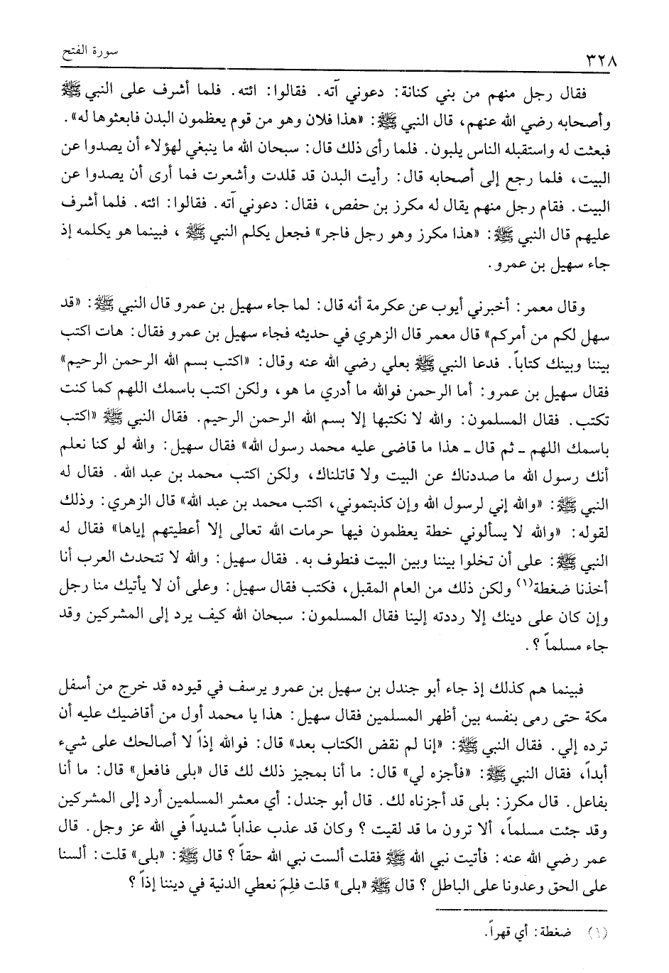 وَقَالَ مَعْمَرٌ: أَخْبَرَنِي أَيُّوبُ عَنْ عِكْرِمَةَ أَنَّهُ قَالَ: لَمَّا جَاءَ سُهَيْلُ بْنُ عَمْرٍو قَالَ النَّبِيَّ صَلَّى اللَّهُ عَلَيْهِ وَسَلَّمَ: «قَدْ سَهُلَ لَكُمْ مِنْ أَمْرِكُمْ» قَالَ مُعْمَرٌ قَالَ الزُّهْرِيُّ فِي حَدِيثِهِ فَجَاءَ سُهَيْلُ بْنُ عَمْرٍو فَقَالَ: هَاتِ أَكْتُبُ بَيْنَنَا وَبَيْنَكَ كِتَابًا. فدعا النبي صلى الله عليه وسلم بعلي رضي الله عنه وقال: «اكتب بسم الله الرحمن الرحيم» فقال سهيل بن عمرو: أما الرحمن فو الله مَا أَدْرِي مَا هُوَ، وَلَكِنِ اكْتُبْ بِاسْمِكَ اللَّهُمَّ كَمَا كُنْتَ تَكْتُبُ. فَقَالَ الْمُسْلِمُونَ: وَاللَّهِ لَا نَكْتُبُهَا إِلَّا بِسْمِ اللَّهِ الرَّحْمَنِ الرَّحِيمِ. فَقَالَ النَّبِيُّ صَلَّى اللَّهُ عَلَيْهِ وَسَلَّمَ «اكْتُبْ بِاسْمِكِ اللَّهُمَّ- ثُمَّ قَالَ- هَذَا مَا قَاضَى عليه محمد رسول الله» فقال سهيل: وَاللَّهِ لَوْ كُنَّا نَعْلَمُ أَنَّكَ رَسُولُ اللَّهِ مَا صَدَدْنَاكَ عَنِ الْبَيْتِ وَلَا قَاتَلْنَاكَ، وَلَكِنِ اكتب محمد بن عبد الله. فَقَالَ لَهُ النَّبِيُّ صَلَّى اللَّهُ عَلَيْهِ وَسَلَّمَ: «وَاللَّهِ إِنِّي لَرَسُولُ اللَّهِ وَإِنْ كَذَّبْتُمُونِي، اكْتُبْ مُحَمَّدُ بْنُ عَبْدِ اللَّهِ» قَالَ الزُّهْرِيُّ: وَذَلِكَ لِقَوْلِهِ: «وَاللَّهِ لَا يَسْأَلُونِي خُطَّةً يُعَظِّمُونَ فِيهَا حرمات الله تعالى إِلَّا أَعْطَيْتُهُمْ إِيَّاهَا» فَقَالَ لَهُ النَّبِيُّ صَلَّى اللَّهُ عَلَيْهِ وَسَلَّمَ: عَلَى أَنْ تُخَلُّوا بَيْنَنَا وبين البيت فنطوف به. فقال سهيل: وَاللَّهِ لَا تَتَحَدَّثُ الْعَرَبُ أَنَّا أُخِذْنَا ضَغْطَةً «1» وَلَكِنْ ذَلِكَ مِنَ الْعَامِ الْمُقْبِلِ، فَكَتَبَ فَقَالَ سهيل: وَعَلَى أَنْ لَا يَأْتِيكَ مِنَّا رَجُلٌ وَإِنْ كَانَ عَلَى دِينِكَ إِلَّا رَدَدْتَهُ إِلَيْنَا فَقَالَ الْمُسْلِمُونَ: سُبْحَانَ اللَّهِ كَيْفَ يُرَدُّ إِلَى الْمُشْرِكِينَ وَقَدْ جَاءَ مُسْلِمًا؟.